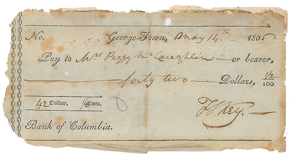 Baltimore lawyer (1779-1843) who was inspired to write the ‘Star-Spangled Banner’ after he witnessed the bombardment of Fort McHenry by the British in 1814. Bank of Columbia check, 6 x 3, filled out and signed by Key, "F. S. Key," payable to Mrs. Peggy McLaughlin for $42.50, May 14, 1806. In very good condition, with mounting remnants to reverse. From the collection of Dr. Lawrence E. Miller.