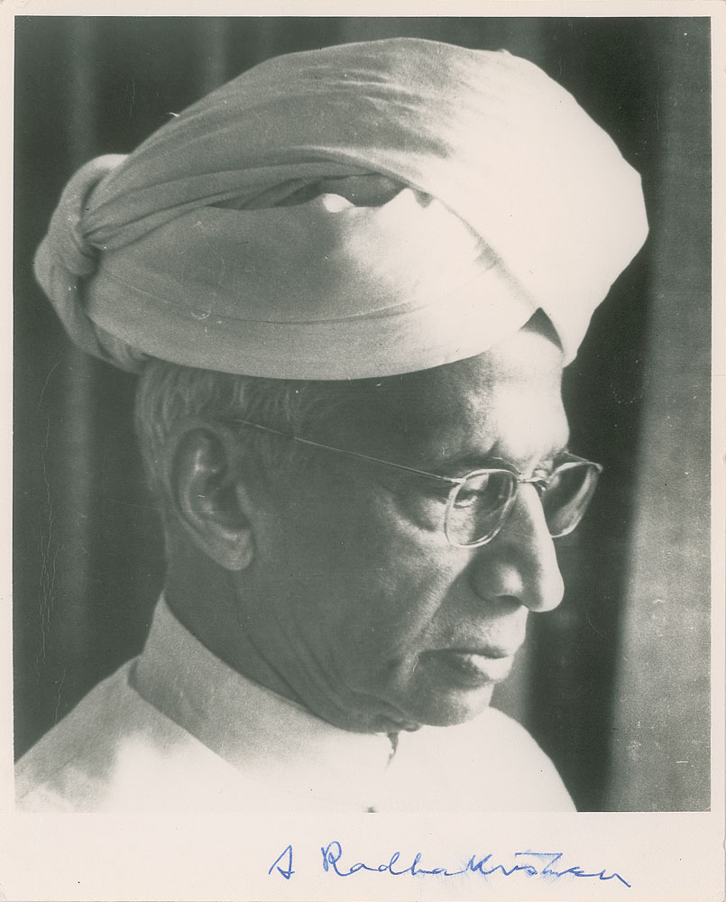 Indian philosopher and statesman (1888-1975) who served as the second president of India from 1962 to 1967. Scarce matte-finish 8 x 10 close-up photo of Sarvepalli Radhakrishnan, signed in the lower border in blue ink, "S. Radhakrishnan." In very good to fine condition, with some creasing to the perimeter, and light brushing to the signature. From the collection of Dr. Lawrence E. Miller.