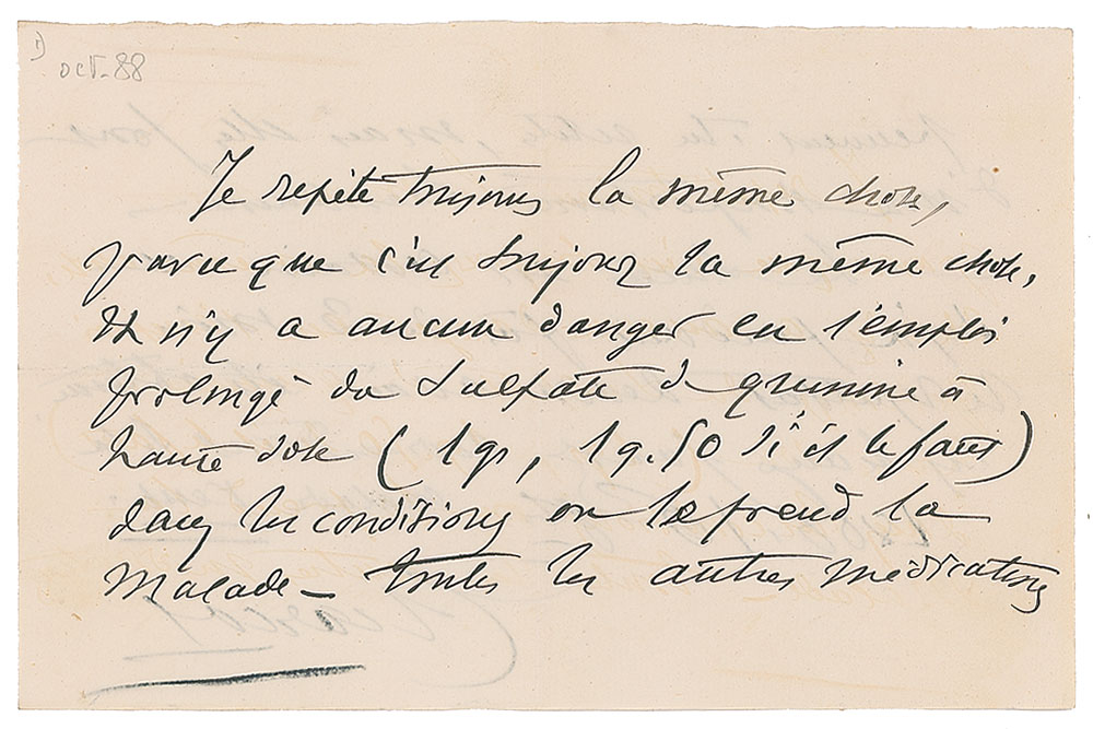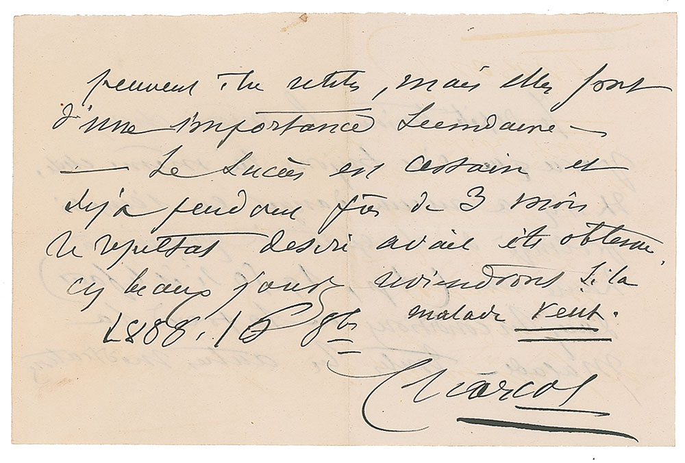 French neurologist (1825-1893) whose work on hysteria and uses of hypnosis greatly impressed Freud and contributed to his studies of the unconscious. Untranslated ALS in French, signed “Charcot,” one page both sides, 8 x 5.25, October 8, 1888. In fine condition, with intersecting folds. From the collection of Dr. Lawrence E. Miller. From the collection of Dr. Lawrence E. Miller.