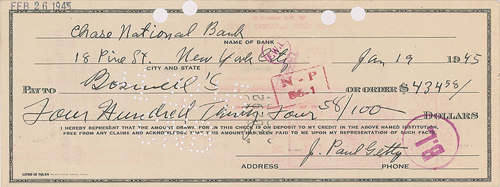 American industrialist, billionaire, and patriarch of the Getty family (1892-1976) who at one time was considered the world's richest private citizen. Chase National Bank check, 8.25 x 3, filled out in another hand and signed by J. Paul Getty, payable to Boswell's for $434.58, January 19, 1945. In fine condition, with four cancellation punch holes to the top edge. From the collection of Dr. Lawrence E. Miller. From the collection of Dr. Lawrence E. Miller.