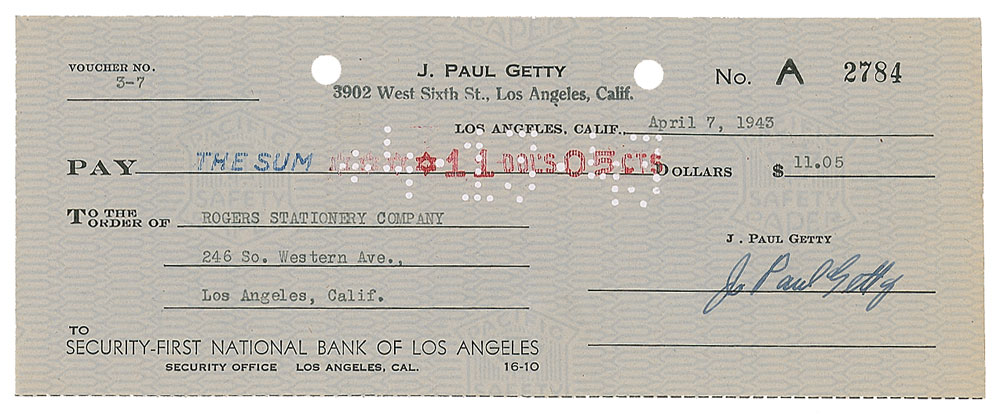 American industrialist, billionaire, and patriarch of the Getty family (1892-1976) who at one time was considered the world's richest private citizen. Personal check, 8.25 x 3.25, filled out in type and signed by J. Paul Getty, payable to Rogers Stationery Company for $11.05, April 7, 1943. In fine condition, with two cancellation punch holes to the top edge. From the collection of Dr. Lawrence E. Miller.
