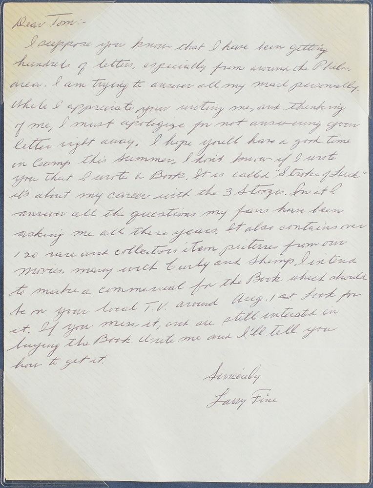 ALS, one page, 5.75 x 7.75, no date, but circa 1973. Letter to Tom, in full: "I suppose you know that I have been getting hundreds of letters, especially from around the Phila. area. I am trying to answer all my mail personally. While I appreciate your writing me, and thinking of me, I must apologize for not answering your letter right away. I hope you'll have a good time in camp this summer. I don't know if I wrote you that I wrote a book. It is called 'Stroke of Luck,' it's about my career with the 3 Stooges. In it I answer all the questions my fans have been asking me all these years. It also contains over 120 rare and collector's item pictures from our movies, many with Curly and Shemp. I intend to make a commercial for the book which should be on your local T.V. around Aug. 1st. Look for it. If you miss it, and are still interested in buying the book write me and I'll tell you how to get it." Mounted, matted, and framed with a plaque and a portrait to an overall size of 22.25 x 16.75. In fine condition.