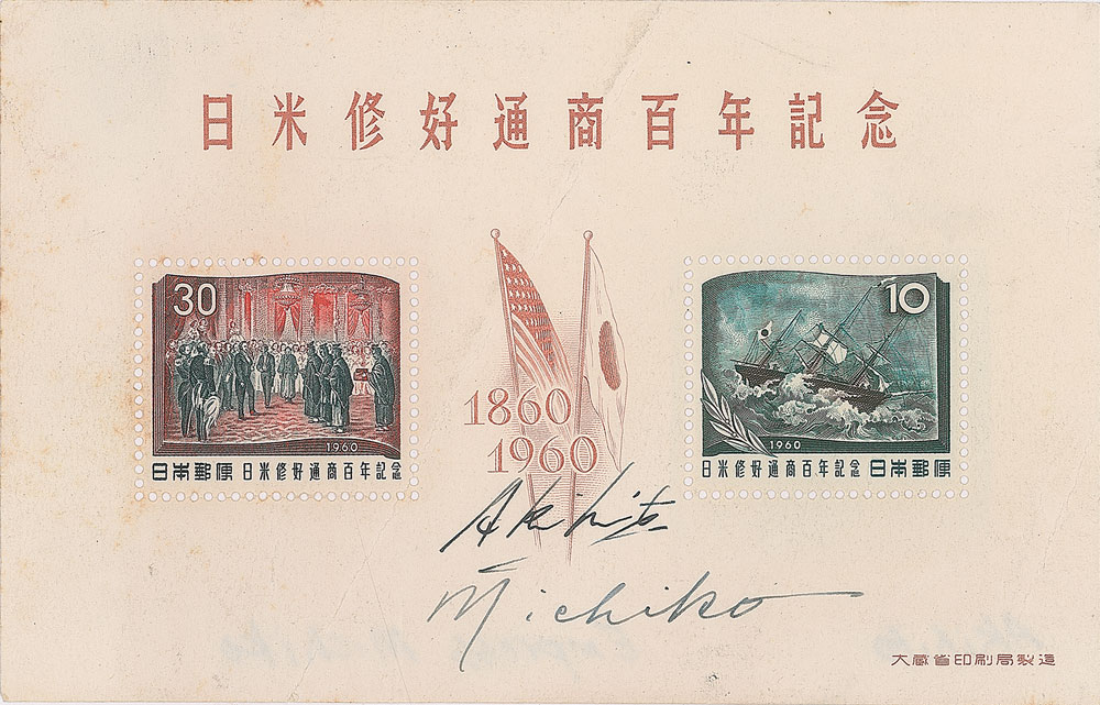 Japanese stamp block commemorating the hundred years between 1860 and 1960, 4.75 x 3, neatly signed by the Japanese emperor and empress in ink, "Akihito" and "Michiko.” In very good to fine condition, with a diagonal crease to the center. A rare signature combination, especially in English.
