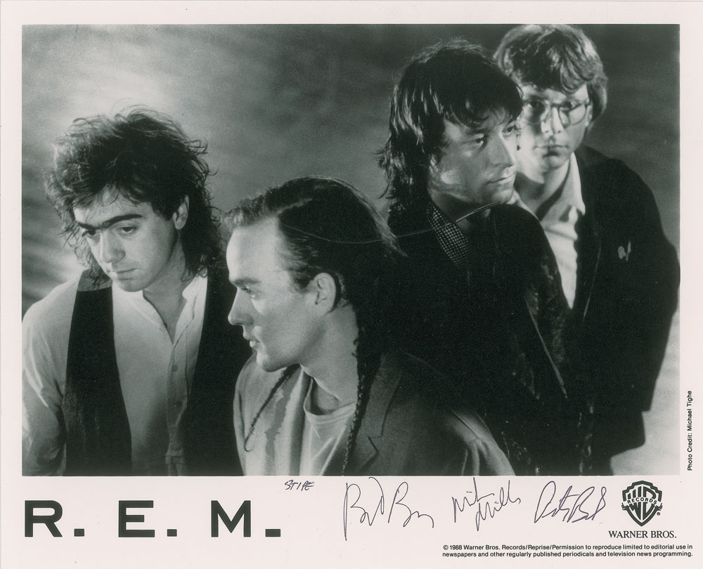 Satin-finish 10 x 8 Warner Bros. promotional photo of R.E.M. during their Green period, signed in the lower border in black ballpoint, "Stipe," "Mike Mills," "Bill Berry," and "Peter Buck." In very good to fine condition, with a crease passing through Buck's chin.