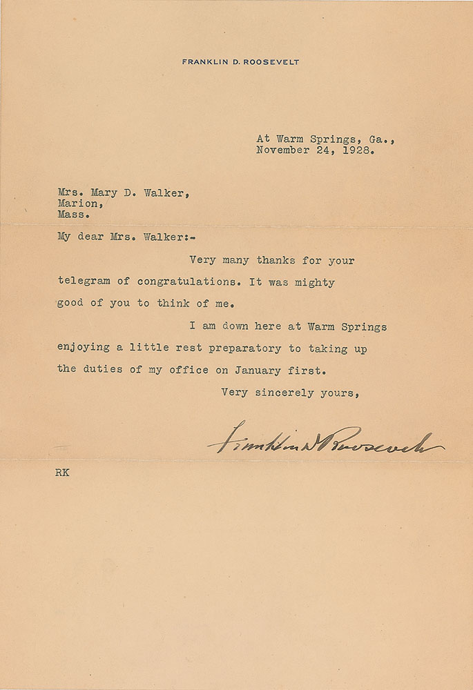 TLS, one page, 7.25 x 10.5, personal letterhead, November 24, 1928. Written from Warm Springs, Georgia, a letter to Mary D. Walker, in full: "Very many thanks for your telegram of congratulations. It was mighty good of you to think of me. I am down here at Warm Springs enjoying a little rest preparatory to taking up the duties of my office on January first." In fine condition. On the referral of presidential candidate and former New York Governor Al Smith, Roosevelt joined the democratic ticket in the 1928 New York state election and defeated Albert Ottinger in the race for governor.