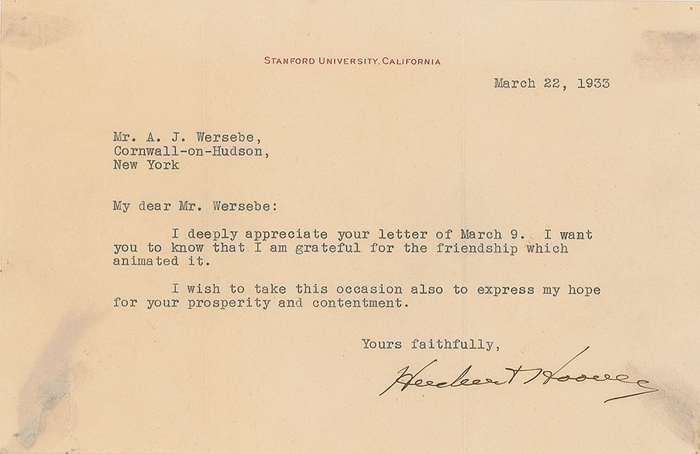Two items: a TLS, one page, 8.5 x 5.5, Stanford University letterhead, March 22, 1933, addressed to A. J. Wersbe, less than three weeks after leaving the White House, in full: "I deeply appreciate your letter of March 9. I want you to know that I am grateful for the friendship which animated it. I wish to take this occasion also to express my hope for your prosperity and contentment"; and a vintage matte-finish 7.75 x 9.5 portrait of Herbert Hoover, signed in the lower border in crisp fountain pen, with reverse bearing notation indicating that it was sent to the same recipient as the letter. In overall very good to fine condition, with light show-through at the corners, and a related tear to the lower left corner, from old mounting remnants on the back of the letter. Accompanied by the original mailing envelope.