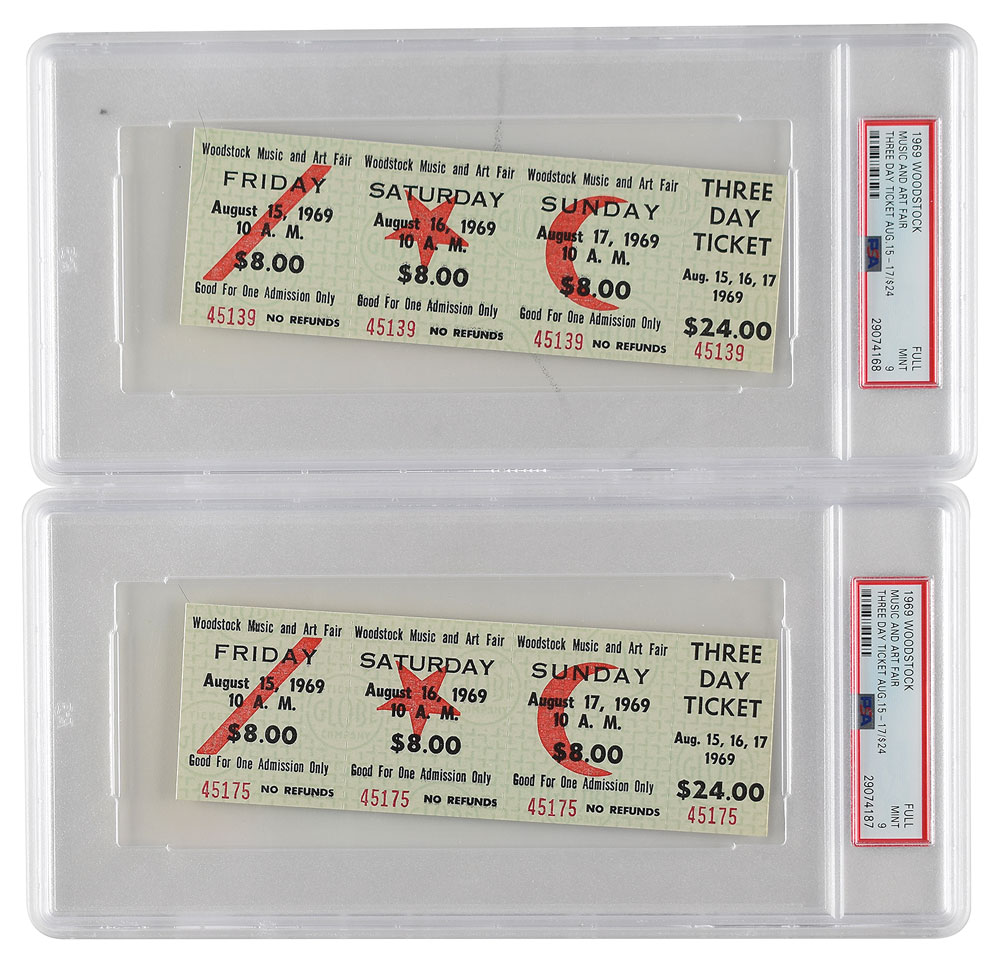 Two original unused three-day admission tickets for the iconic Woodstock Music and Art Fair, each 6 x 2, issued for August 15-17, 1969, numbered "45139" and "45175." Both are individually encapsulated and graded by PSA/DNA as "MINT 9." In overall fine condition.
