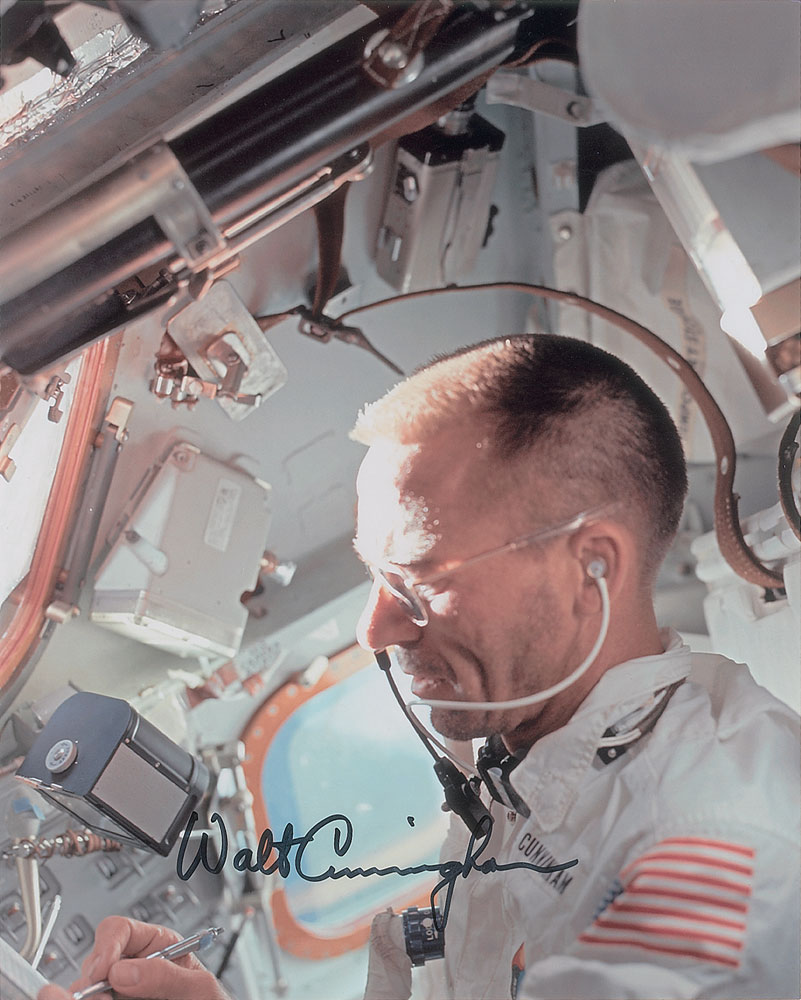 Color satin-finish 8 x 10 photo of Walt Cunningham jotting down notes during the Apollo 7 mission, signed nicely in black felt tip. In fine condition.