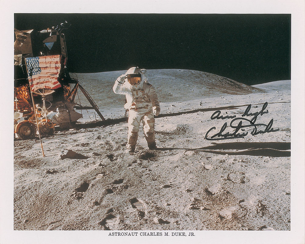 Official color 10 x 8 NASA lithograph of LMP Duke saluting the American flag on the lunar surface during the Apollo 16 mission, signed in black felt tip, "Aim high, Charlie Duke." In very fine condition.