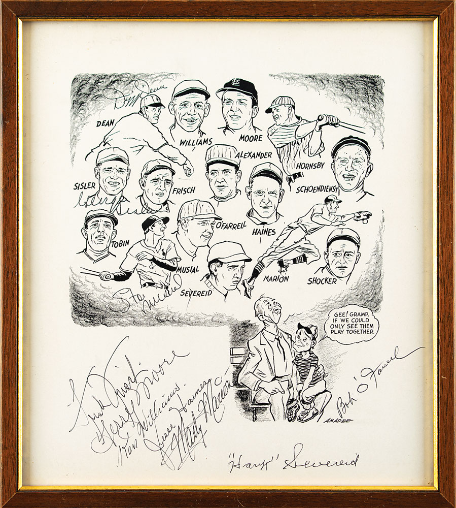 Uncommon 9.5 x 10.75 print of a drawing by cartoonist Amadee Wohlschlaeger, depicting a boy on his grandfather's lap imagining players from the great St. Louis Browns and Cardinals of the past, signed in black ballpoint by 10 ballplayers, including: Stan Musial, Dizzy Dean, Frankie Frisch, Jesse Haines, Marty Marion, Terry Moore, Bob O'Farrell, Hank Severeid, George Sisler, and Ken Williams. Framed and in fine condition.