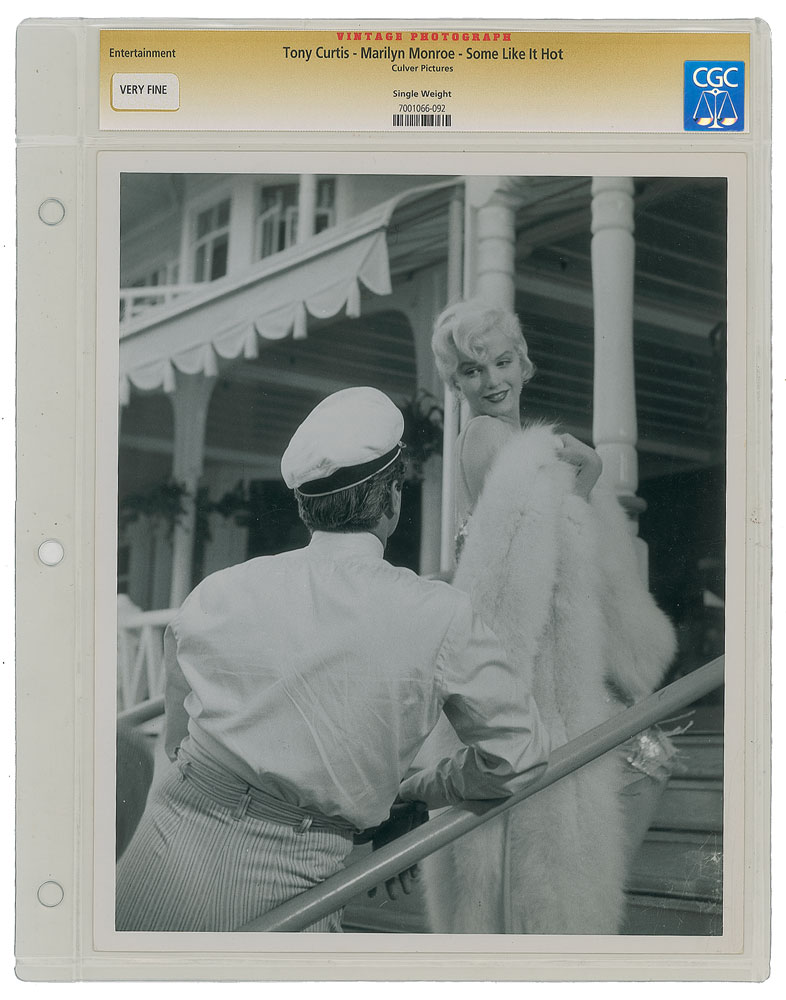 Original vintage glossy 10 x 8 silver gelatin promo still from Billy Wilder's 1959 romantic comedy Some Like It Hot, showing Marilyn Monroe glancing over her shoulder at co-star Tony Curtis. Reverse bears a Culver Pictures credit stamp. Encapsulated and graded by CGC as "Very Fine." In fine condition.