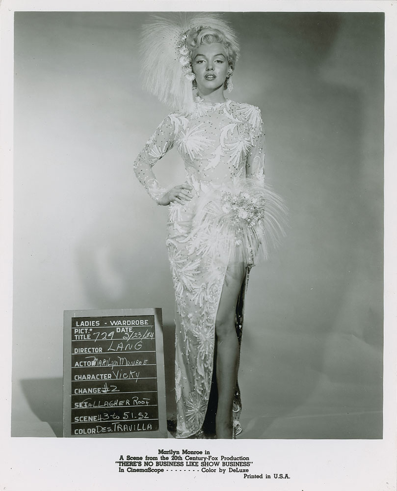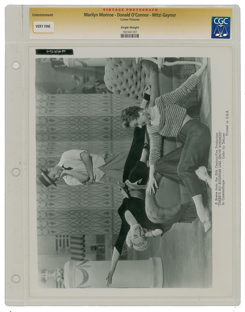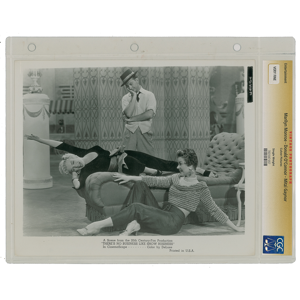 Desirable trio of original vintage glossy 8 x 10 silver gelatin movie stills from 20th Century-Fox's 1954 musical There's No Business Like Show Business: one showing Monroe doing a leg kick in a dazzling gown, encapsulated and graded by CGC as "Excellent"; one showing Monroe with co-stars Donald O'Connor and Mitzi Gaynor, with a Culver Pictures credit stamp on the reverse, encapsulated and graded by CGC as "Very Fine"; and one showing a wardrobe test of Monroe in costume as Vicky Hoffman. In overall fine condition.