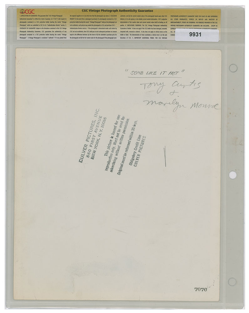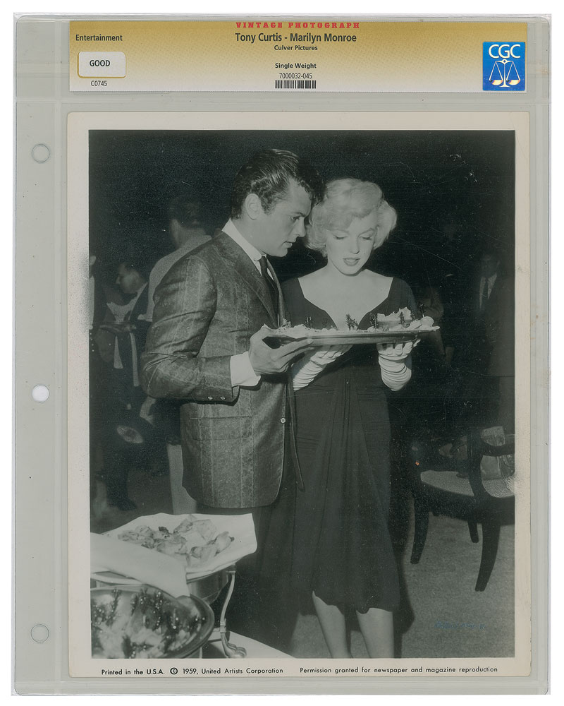 Original vintage glossy 10 x 8 silver gelatin photograph for Billy Wilder's 1959 romantic comedy Some Like It Hot, showing Marilyn Monroe and co-star Tony Curtis looking at a plate of hors d'oeuvres. Reverse bears a Culver Pictures credit stamp. Encapsulated and graded by CGC as "Good." In fine condition.