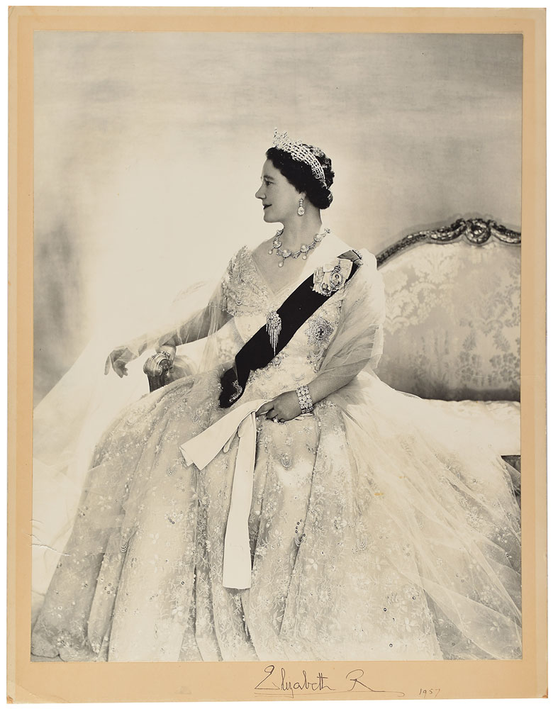 Splendid oversized matte-finish 14 x 18 photo of the Queen Mother in her crown jewels, affixed to its original 15.5 x 20 mount, signed on the mount in fountain pen, "Elizabeth R, 1957." In very good condition, with creasing across the center, a crease to the lower left corner tip, and a tear to the left edge of the image.