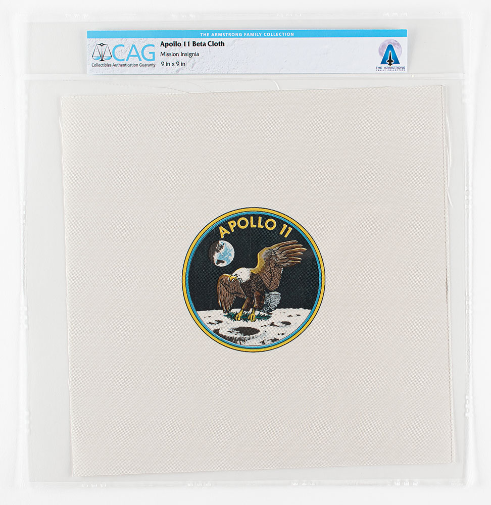Very desirable 9 x 9 swatch of Beta cloth featuring the Apollo 11 mission emblem, deriving from the estate of Neil Armstrong. In very fine condition. Encapsulated in a CAG authentication sleeve. Provenance: Heritage Auctions, The Armstrong Family Collection, May 2019.