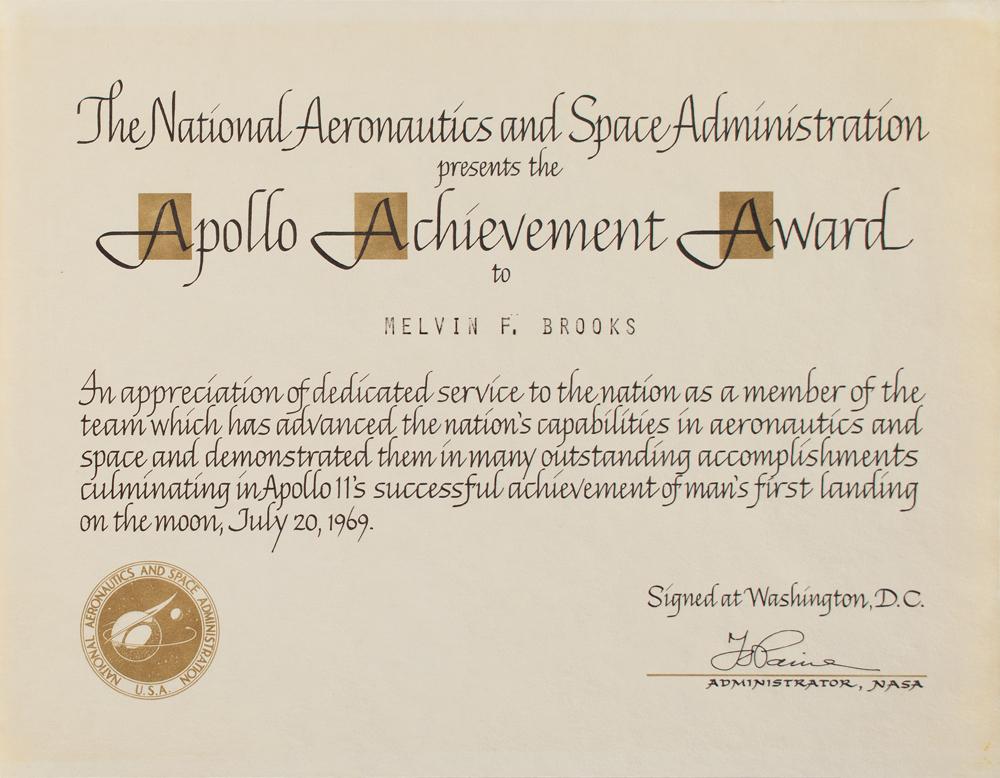 Scarce NASA certificate for the "Apollo Achievement Award," 10 x 7.75, presented to Melvin F. Brooks, with printed text below: "In appreciation of dedicated service to the nation as a member of the team which has advanced the nation's capabilities in aeronautics and space and demonstrated them in many outstanding accomplishments culminating in Apollo 11's successful achievement of man's first landing on the moon, July 20, 1969." Lower right bears a preprinted signature of NASA Administrator Thomas O. Paine. In fine condition, with faint toning from prior display. Mel Brooks enjoyed a long and distinguished NASA career and is mentioned throughout 'Failure Is Not An Option' by Eugene Kranz.