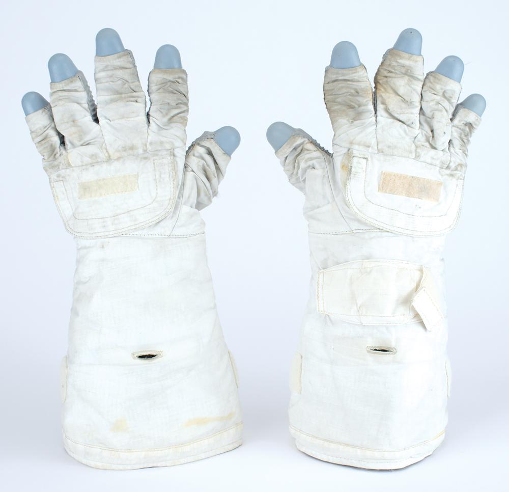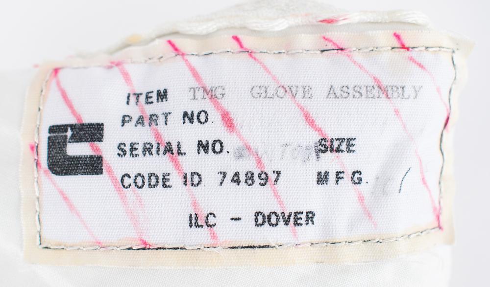 Space Shuttle gloves were often flown and then downgraded to the Water Immersion Training facility where crews would practice underwater; the handwritten serial numbers likely indicate use in training at a minimum. The TMG is the outermost layer of the spacesuit and provides insulation, radiation shielding, and protection from micrometeorites that could otherwise puncture the suit.