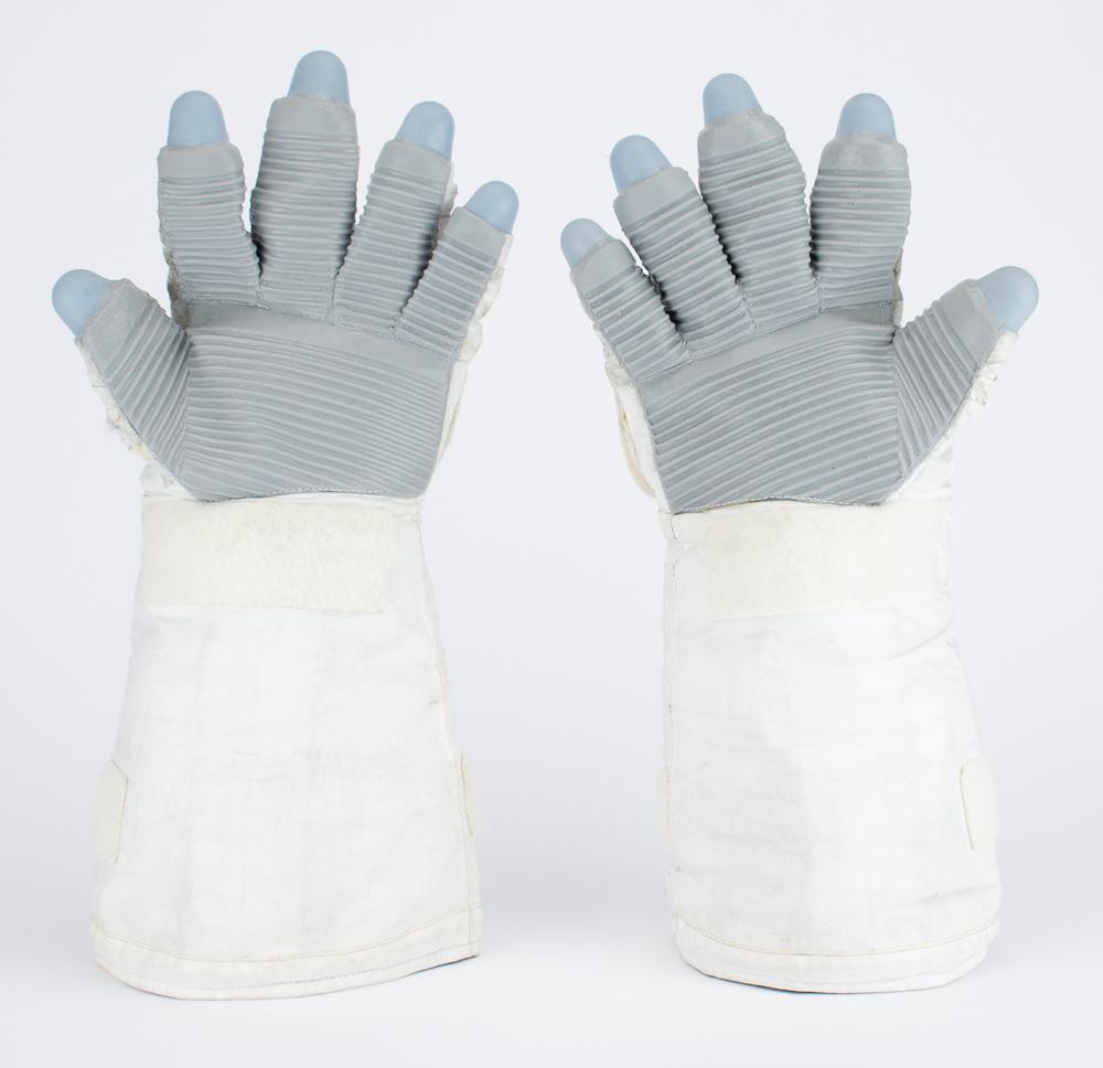 Fantastic pair of left- and right-handed 4000 series Space Shuttle glove TMGs (Thermal Micrometeoroid Garments), both with ILC-Dover tags sewn inside with partially indiscernible annotations; one denotes a part number of "0106-88074-01," serial number of "WT001," and a manufacture date of "10/86." The glove TMGs feature gray palms with blue fingertips. In overall very good to fine condition.