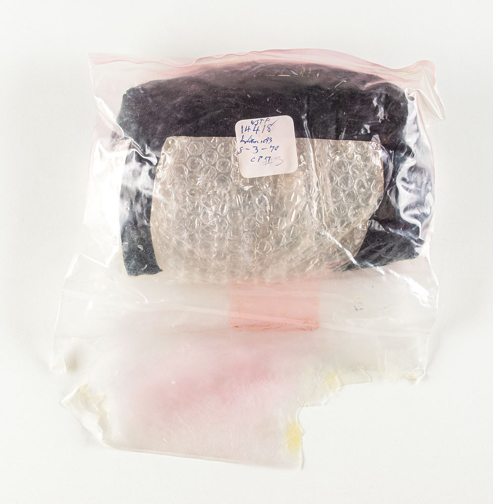Large wound length of wire from the Lunar Receiving Laboratory, approximately measuring 5.25″in diameter, sealed within its original plastic deaccession bag, marked as No. 3, with annotated label: "WSTF, 14418?1093, 8-3-70, CPM." Interior red deaccession label dated July 16, 1970. In fine condition, with notable wear to bag.