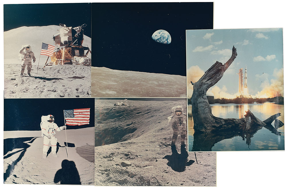 Group lot of five oversized official color glossy NASA photographs, 14 x 11 and 11 x 14, each depicting historic moments from the Apollo program: the famed ‘Earthrise’ image taken by Bill Anders during the Apollo 8 mission; Alan Shepard holding the American flag during the Apollo 14 mission; Jim Irwin saluting the American flag during the Apollo 15 mission; Charlie Duke on the lunar surface during the Apollo 16 mission; and the launch of the Apollo 16 mission on April 16, 1972. Reverse of each bearing “A Kodak Paper” watermarks. In overall fine condition, with slight curling to edges. From the personal collection of Paul Kruppenbacher, a member of the NASA Houston Landing and Recovery Division who trained Apollo astronauts in water recovery procedures and was deployed on U.S. Navy aircraft carriers for crew and spacecraft recovery operations.