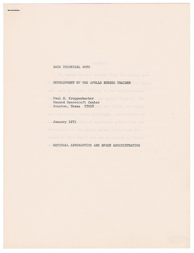 A stapled 23-page manual entitled “Development of the Apollo Egress Trainer,” written by Paul H. Kruppenbacher, dated January 1971, with sections related to Design and Construction and Apollo Egress Trainer Applications.