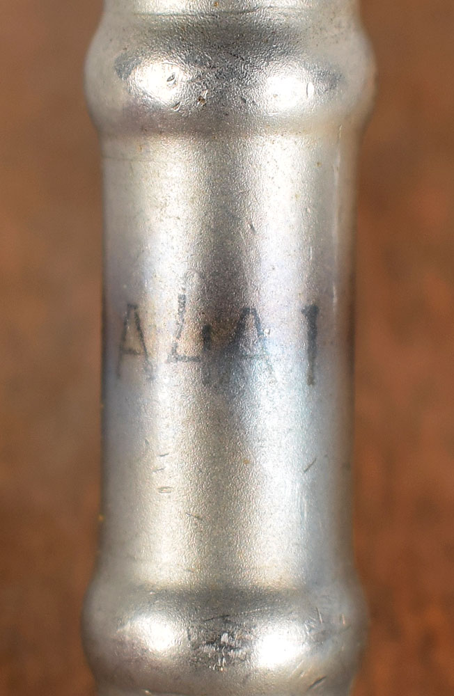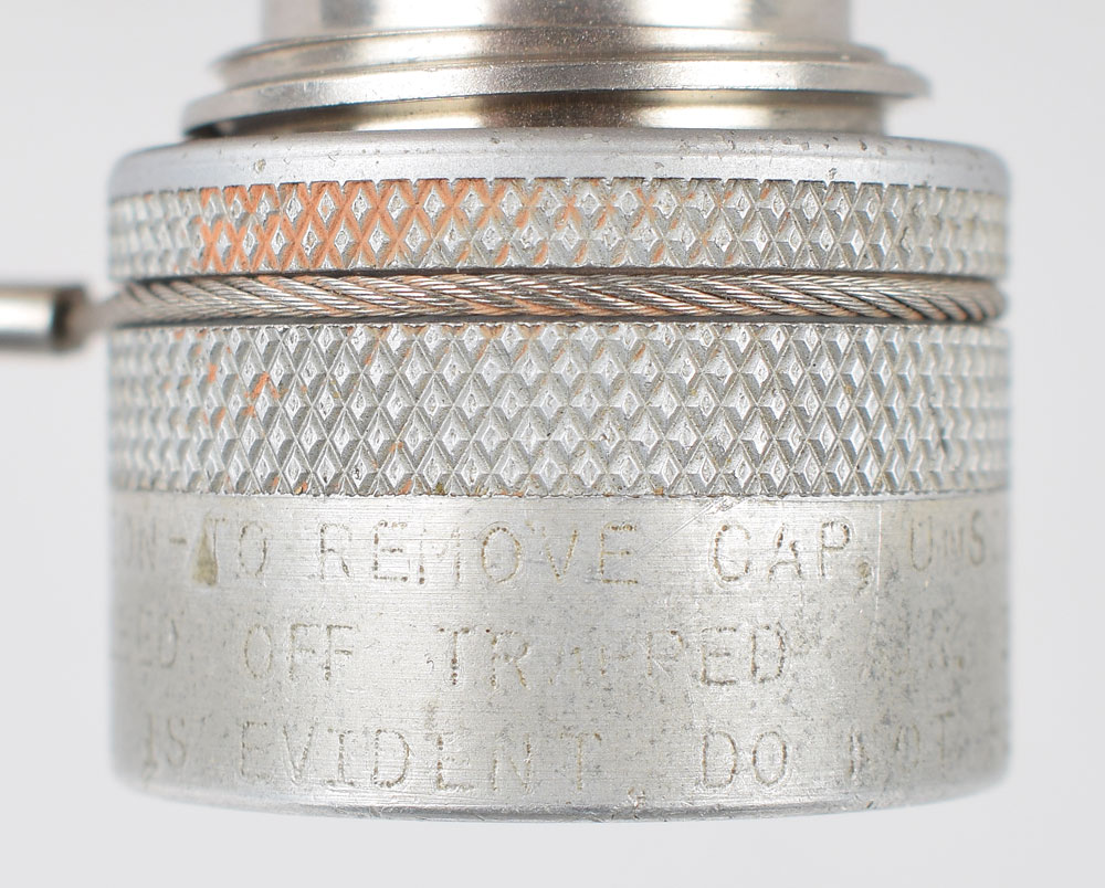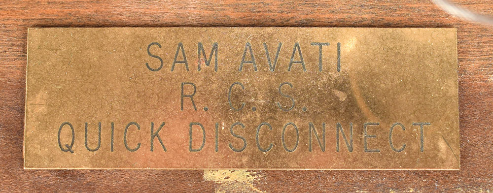 Apollo-era Reaction Control System disconnect coupling, measuring 4.75″ x 1.5″, with removal directions impressed on cap and part numbers to body dated to August 1966. The hardware is presented on a wooden 5.5 x 3.25 x .75 base, with detached plate presented to “Sam Avanti, R. C. S., Quick Disconnect.” In fine condition.
