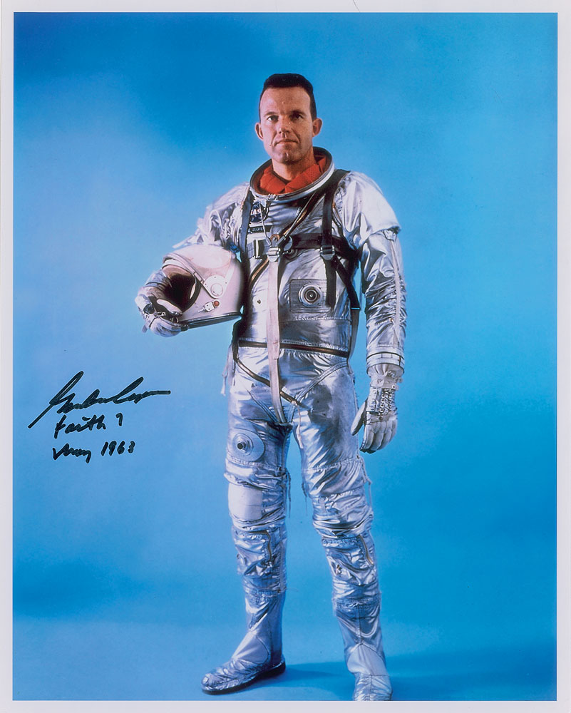 Color satin-finish 8 x 10 photo of Cooper posing in his silver Mercury space suit against a blue background, signed in black felt tip, "Gordon Cooper, Faith 7, May 1963." In very fine condition.