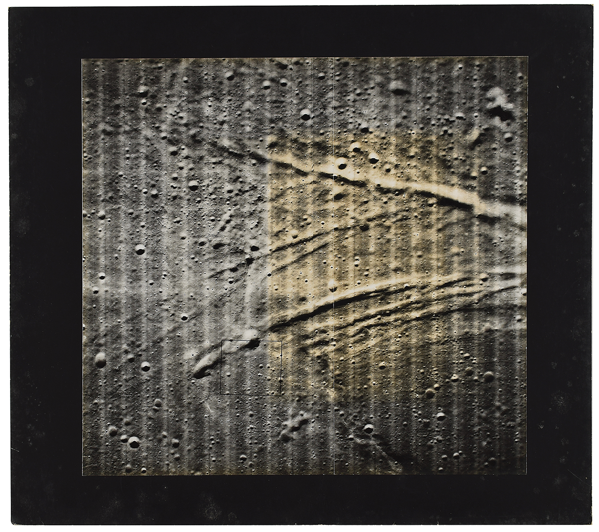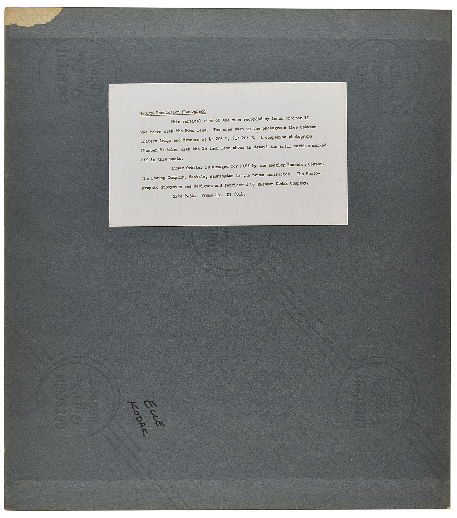 Original vintage semi-glossy 12.75 x 13.75 silver gelatin photograph of the moon's surface taken by Lunar Orbiter 2 in November 1966, showing a wide-angle vertical view of the area between Craters Arago and Manners in the Sea of Tranquility. Affixed to a 16 x 18 mount, with a detailed affixed caption on the reverse, in part: "This vertical view of the moon recorded by Lunar Orbiter II was taken with the 80mm lens. The area seen in the photograph lies between craters Arago and Manners at 4° 20' N, 21°, 20' E. A companion photograph (Number 8) taken with the 24 inch lens shows in detail the small portion marked off in this photo…Site P-34. Frame 44. KI 2014." Also annotated on the reverse in felt tip, "Elle, Kodak." In very good to fine condition, with a light block of toning to the center of the image, and edgewear and slight soiling to the mount.