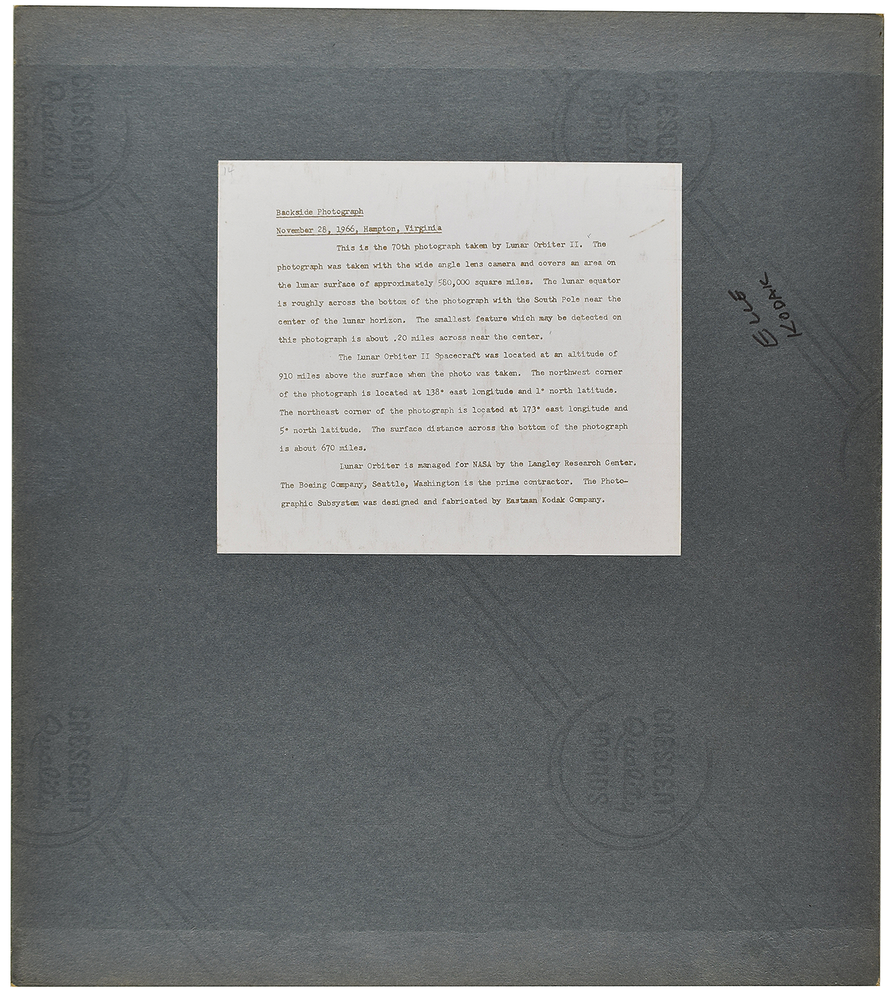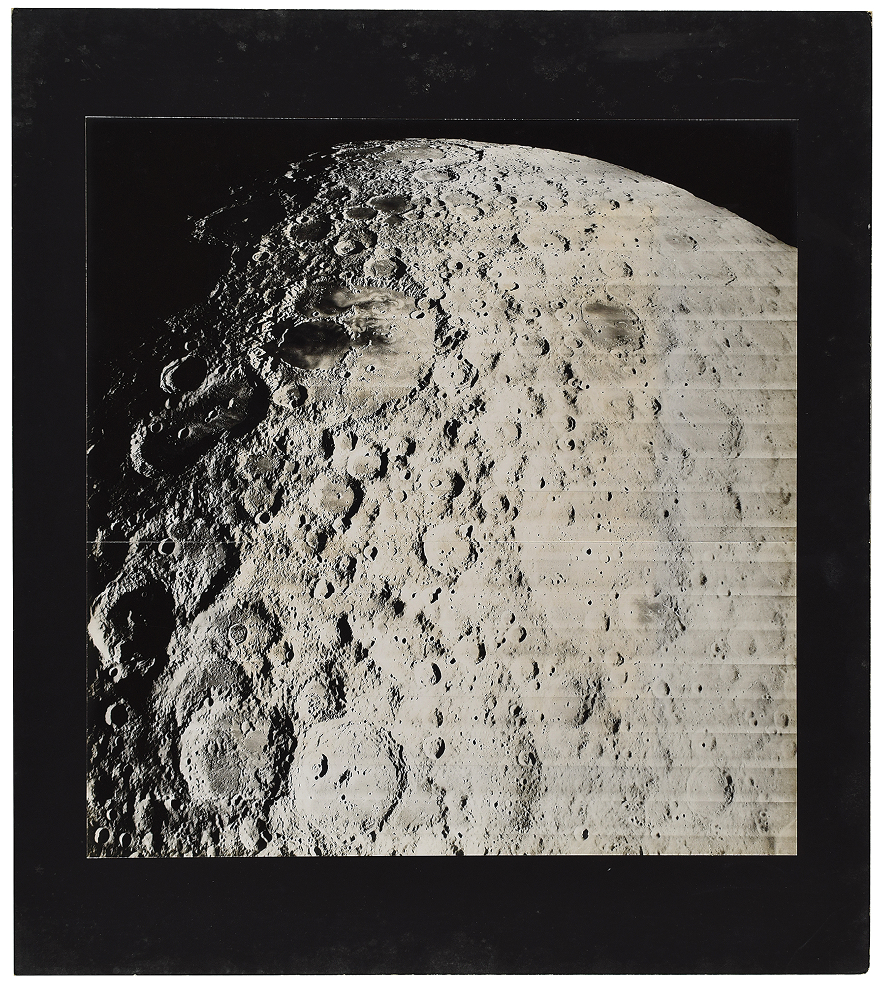 Impressive original vintage semi-glossy 13.25 x 13.75 silver gelatin photograph of the moon's surface taken by Lunar Orbiter 2 in November 1966, showing a large wide-angle view of the backside of the moon's cratered landscape. Affixed to a 16 x 18 mount, with an affixed caption on the reverse, in part: "This is the 70th photograph taken by Lunar Orbiter II. The photograph was taken with the wide angle lens camera and covers an area on the lunar surface of approximately 580,000 square miles. The lunar equator is roughly across the bottom of the photograph with the South Pole near the center of the lunar horizon. The smallest feature which may be detected on the photograph is about .20 miles across near the center." Also annotated on the reverse in felt tip, "Elle, Kodak." In fine condition, with minor soiling to the mount.