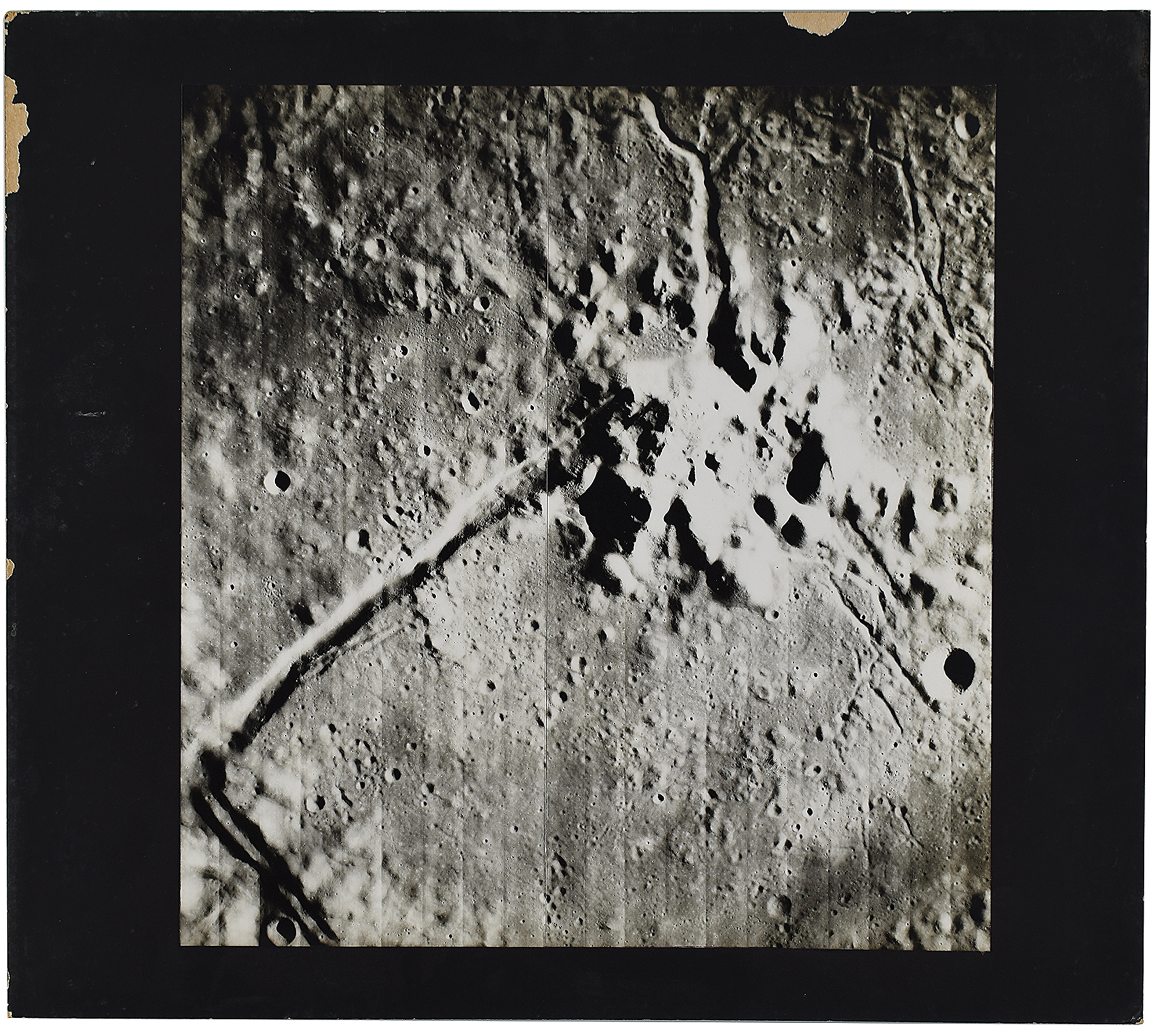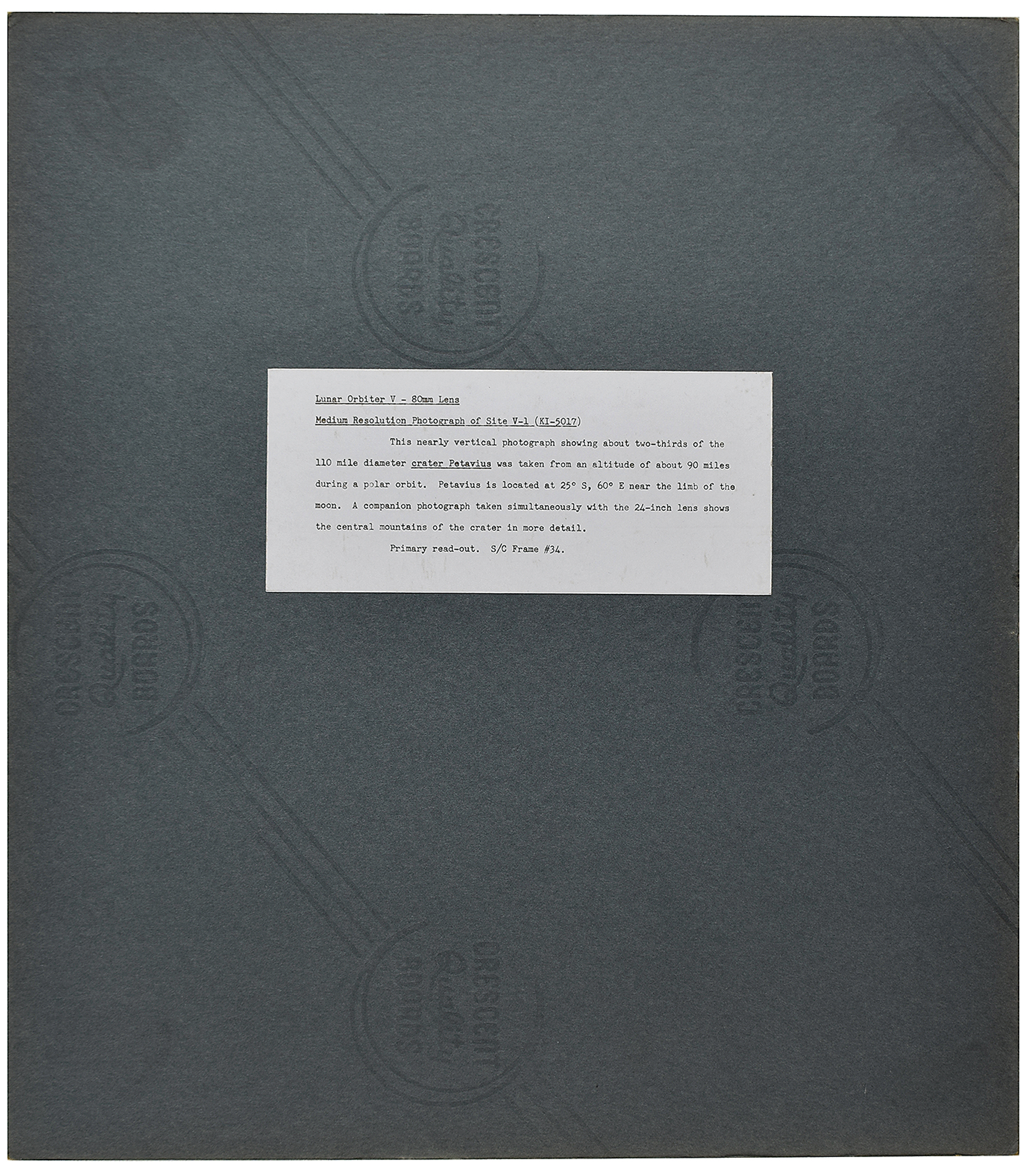 Original vintage semi-glossy 13.5 x 13 silver gelatin photograph of the moon's surface taken by Lunar Orbiter 5 in August 1967, showing a detailed near-vertical view of Crater Petavius from polar orbit. Affixed to a 16 x 18 mount, with a typed caption on the reverse, in full: "Lunar Orbiter V - 80mm Lens, Medium Resolution Photograph of Site V-1 (KI-5017). This nearly vertical photograph showing about two-thirds of the 110 mile diameter crater Petavius was taken from an altitude of about 90 miles during a polar orbit. Petavius is located at 25° S, 60° E near the limb of the moon. A companion photograph taken simultaneously with the 24-inch lens shows the central mountains of the crater in more detail. Primary read-out. S/C Frame #34." In very good to fine condition, with chipping to edges of the mount.