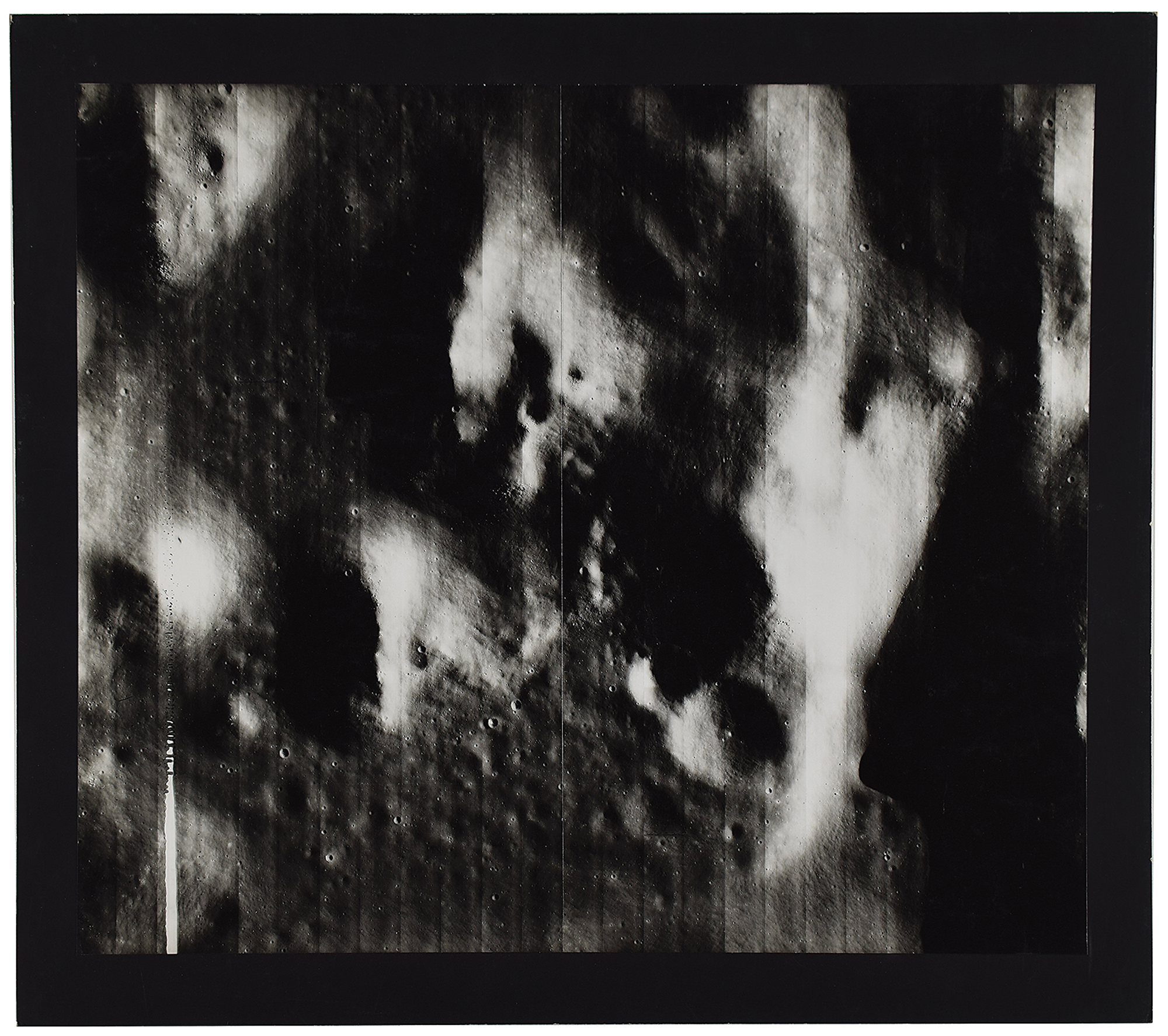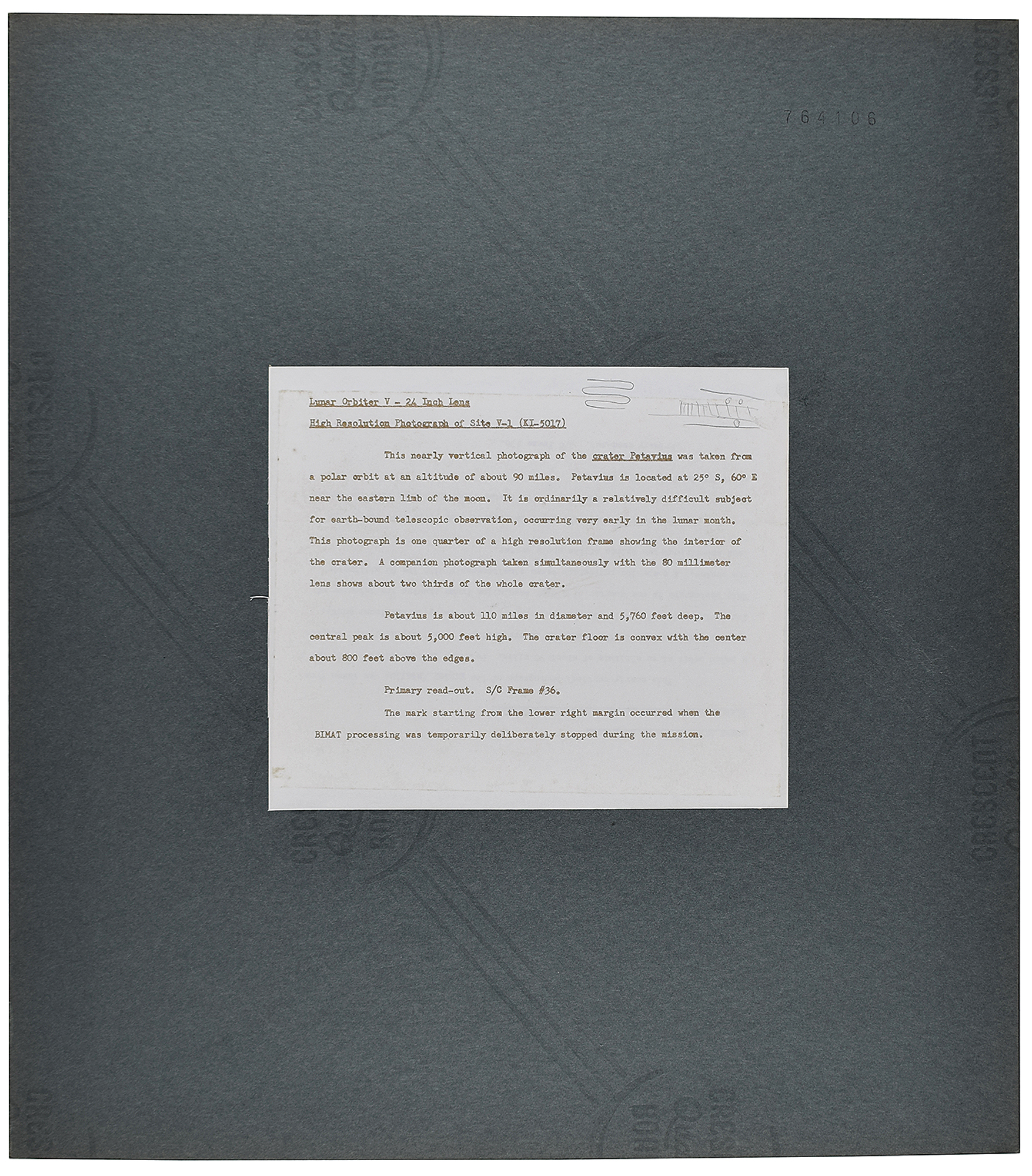 Original vintage semi-glossy 13.75 x 16 silver gelatin photograph of the moon's surface taken by Lunar Orbiter 5 in August 1967, showing a near-vertical view of the large lunar impact crater Petavius, southeast of the Mare Fecunditatis. Affixed to a 16 x 18 mount, with a typed caption on the reverse, in full: "Lunar Orbiter V - 24 Inch Lens, High Resolution Photograph of Site V-1 (KI-5017). This nearly vertical photograph of the crater Petavius was taken from a polar orbit at an altitude of about 90 miles. Petavius is located at 25° S, 60° E near the eastern limb of the moon. It is ordinarily a relatively difficult subject for earth-bound telescopic observation, occurring very early in the lunar month. This photograph is one quarter of a high resolution frame showing the interior of the crater. A companion photograph taken simultaneously with the 80 millimeter lens shows about two thirds of the whole crater. Petavius is about 110 miles in diameter and 5,760 feet deep. The central peak is about 5,000 feet high. The crater floor is convex with the center about 800 feet above the edges. Primary read-out. S/V Frame #36. The mark starting from the lower right margin occurred when the BIMAT processing was temporarily deliberately stopped during the mission." In fine condition, with a light block of toning to image and slight edgewear to the mount.