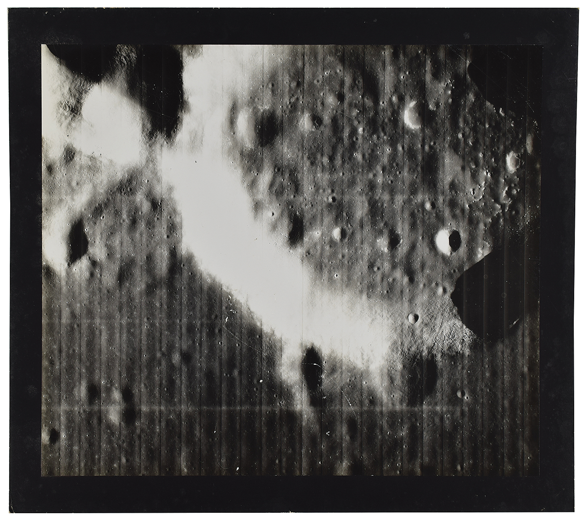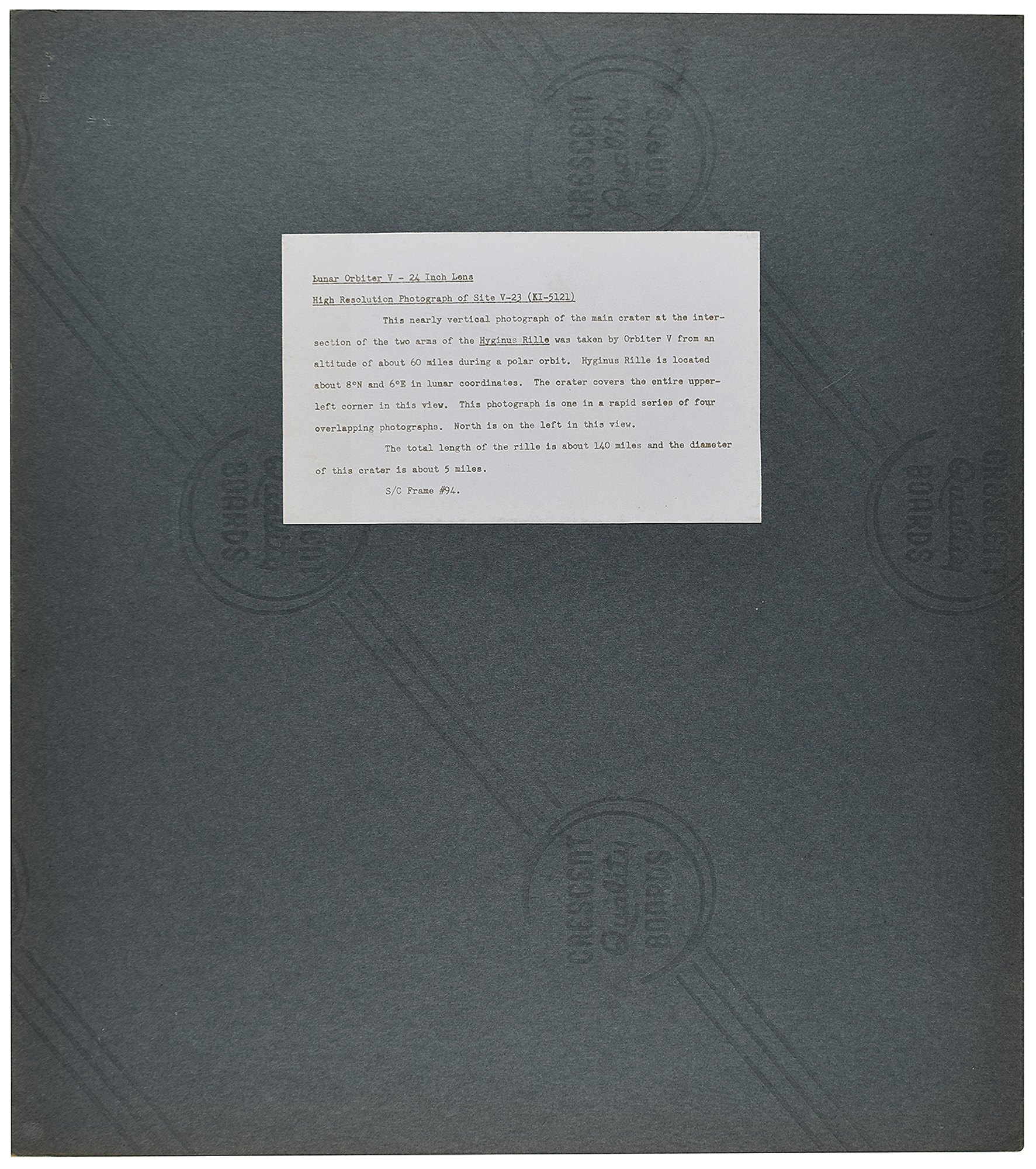 Original vintage semi-glossy 13.5 x 15.75 silver gelatin photograph of the moon's surface taken by Lunar Orbiter 5 in August 1967, showing a near-vertical view of the Hyginus Rille. Affixed to a 16 x 18 mount, with a typed caption on the reverse, in full: "Lunar Orbiter V - 24 Inch Lens, High Resolution Photograph of Site V-23 (KI-5121). This nearly vertical photograph of the main crater at the intersection of the two arms of the Hyginus Rille was taken by Orbiter V from an altitude of about 60 miles during a polar orbit. Hyginus Rille is located about 8°N and 6°E in lunar coordinates. The crater covers the entire upper-left corner in this view. This photograph is one in a rapid series of four overlapping photographs. North is on the left in this view. The total length of the rille is about 140 miles and the diameter of this crater is about 5 miles. S/C Frame #94." In very good to fine condition, with a few surface scratches to image and slight edgewear to the mount.