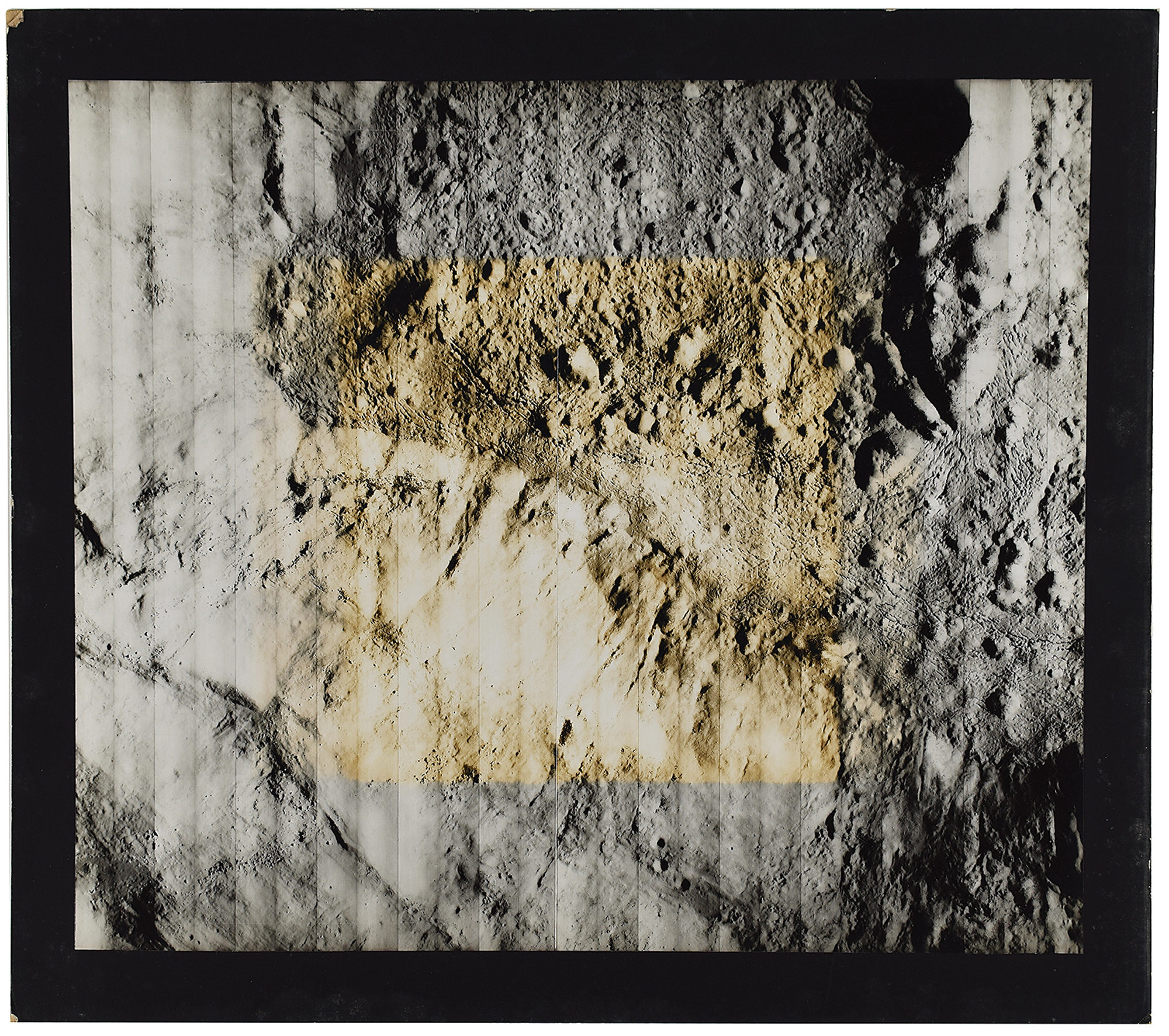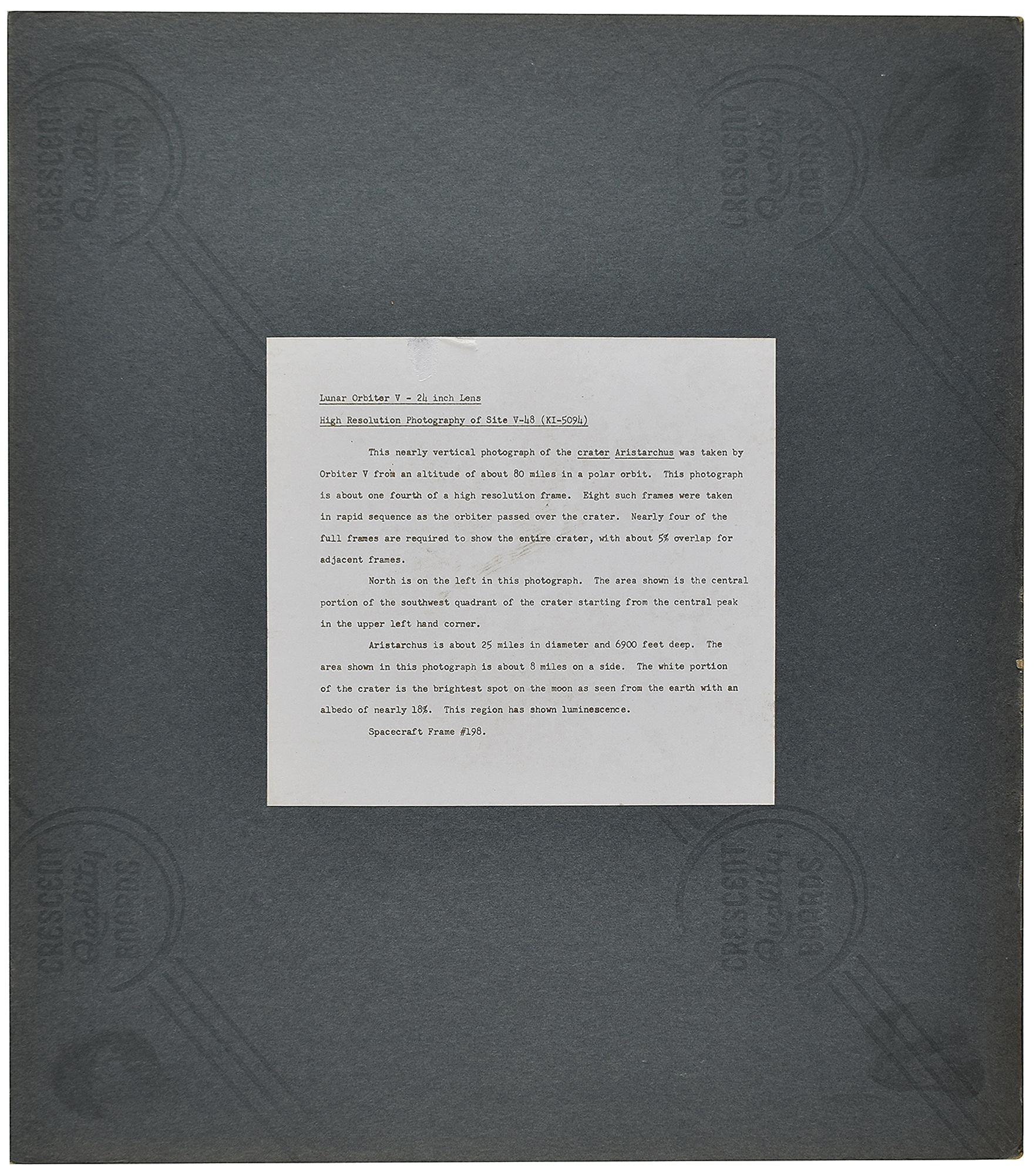 Original vintage semi-glossy 13.75 x 16 silver gelatin photograph of the moon's surface taken by Lunar Orbiter 5 in August 1967, showing a near-vertical view of Crater Aristarchus, the brightest spot on the moon. Affixed to a 16 x 18 mount, with a typed caption on the reverse, in full: "Lunar Orbiter V - 24 Inch Lens, High Resolution Photograph of Site V-48 (KI-5094). This nearly vertical photograph of the crater Aristarchus was taken by Orbiter V from an altitude of about 80 miles in a polar orbit. This photograph is about one fourth of a high resolution frame. Eight such frames were taken in rapid sequence as the orbiter passed over the crater. Nearly four of the full frames are required to show the entire crater, with about 5% overlap for adjacent frames. North is on the left in this photograph. The area shown is the central portion of the southwest quadrant of the crater starting from the central peak in the upper left hand corner. Aristarchus is about 25 miles in diameter and 6900 feet deep. The area shown in this photograph is about 8 miles on a side. The white portion of the crater is the brightest spot on the moon as seen from earth with an albedo of nearly 18%. This region Half sheet shown luminescence. Spacecraft Frame #198." In very good to fine condition, with a block of toning stain to the image and wear to corners of the mount.