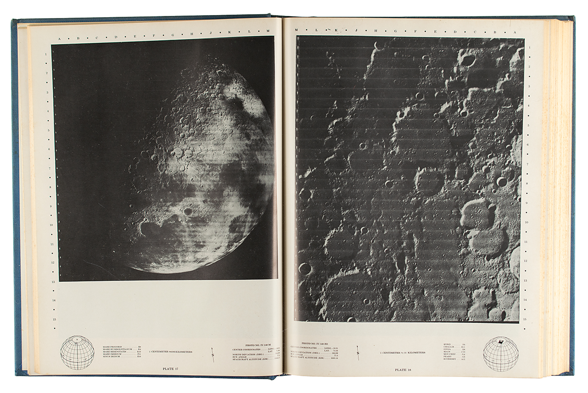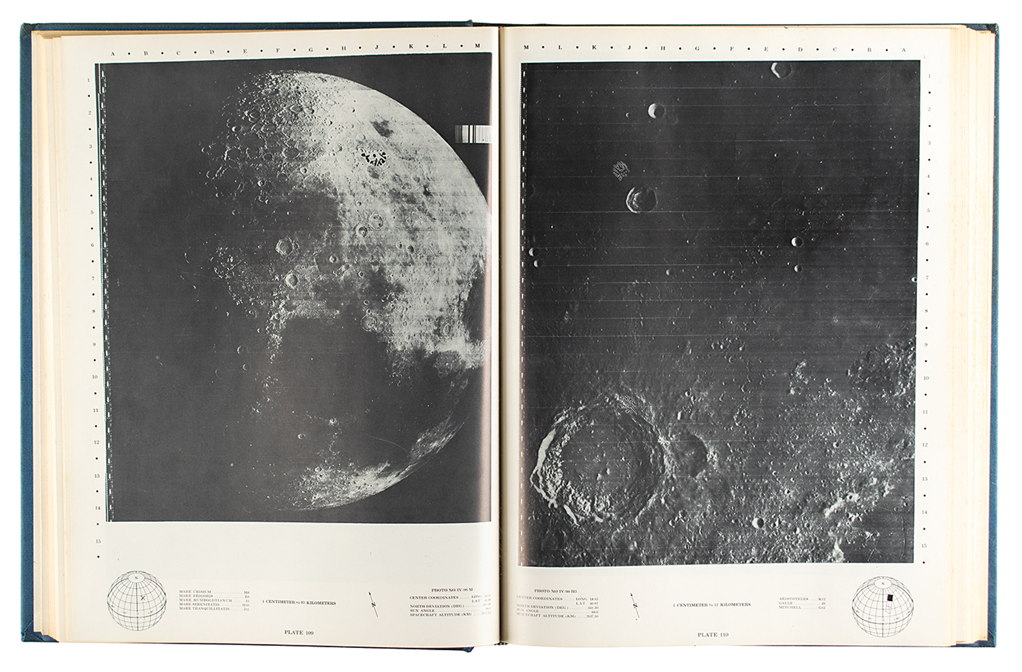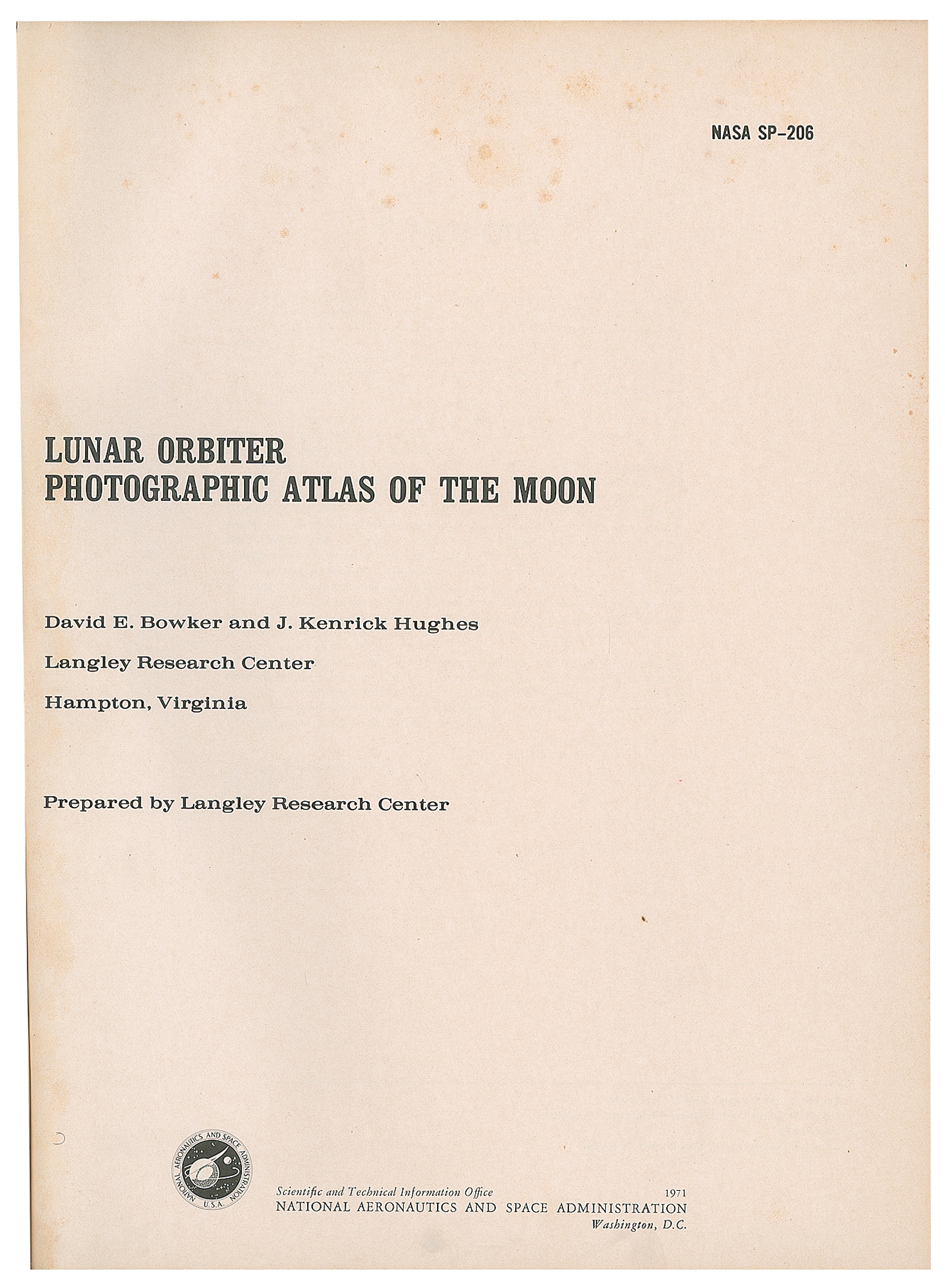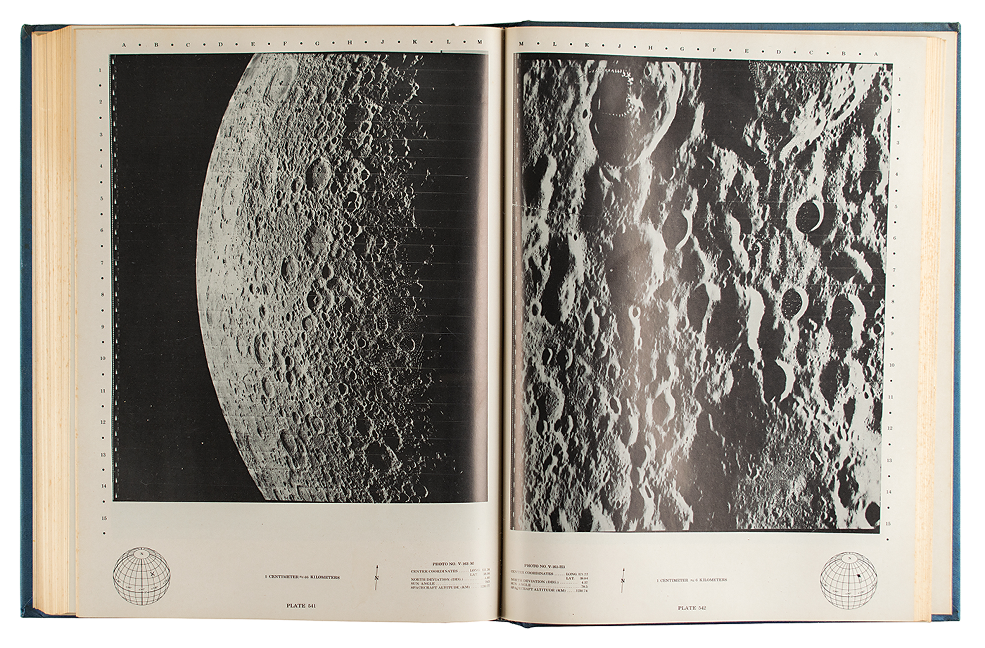 The definitive reference book for Lunar Orbiter photographs: Lunar Orbiter Photographic Atlas of the Moon by David E. Bowker and J. Kendrick Hughes. Washington, DC: US Government Printing Office, 1971. Hardcover, 10.74 x 14, 675 pages. Following some introductory notes, the atlas contains 675 full-page plates reproducing photographs captured by Lunar Orbiters I–V. In very good condition, with scuffing to exterior, sunning to spine, and some scattered foxing to textblock.