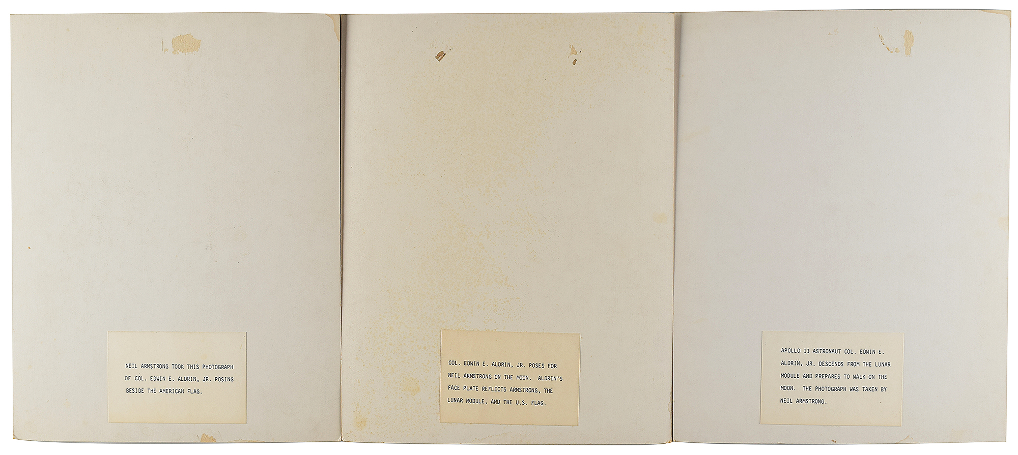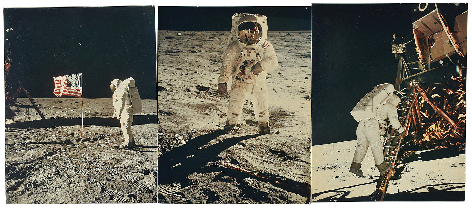 Three original vintage color semi-glossy 9 x 11.5 photographs taken during the Apollo 11 mission, including shots of Buzz Aldrin descending the LM's ladder, Aldrin standing next to the American flag, and the famous 'visor' shot of Aldrin in which Neil Armstrong's reflection is seen. Each is affixed to a same-size mount and captioned on the reverse: "Apollo 11 Astronaut Col. Edwin E. Aldrin, Jr. descends from the Lunar Module and prepares to walk on the moon. The photograph was taken by Neil Armstrong," "Neil Armstrong took this photograph of Col. Edwin E. Aldrin, Jr. posing beside the American flag," and "Col. Edwin E. Aldrin, Jr. poses for Neil Armstrong on the moon. Aldrin's face plate reflects Armstrong, the Lunar Module, and the U.S. flag." In overall fine condition, with some subtle spotting to photo finishes, and slight foxing to the mounts on the reverse.