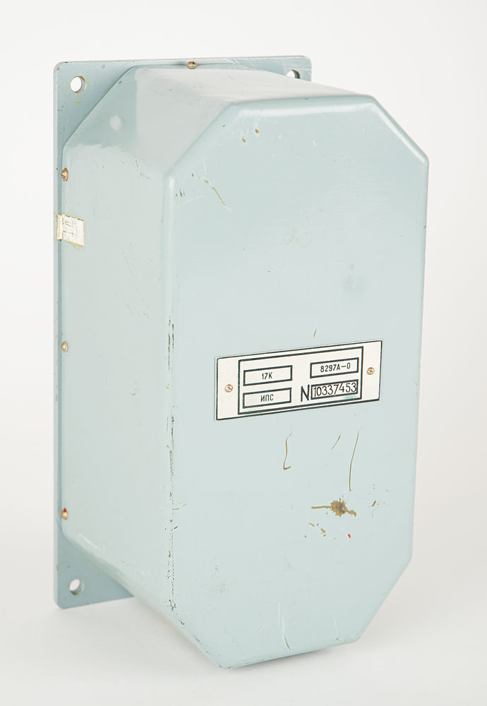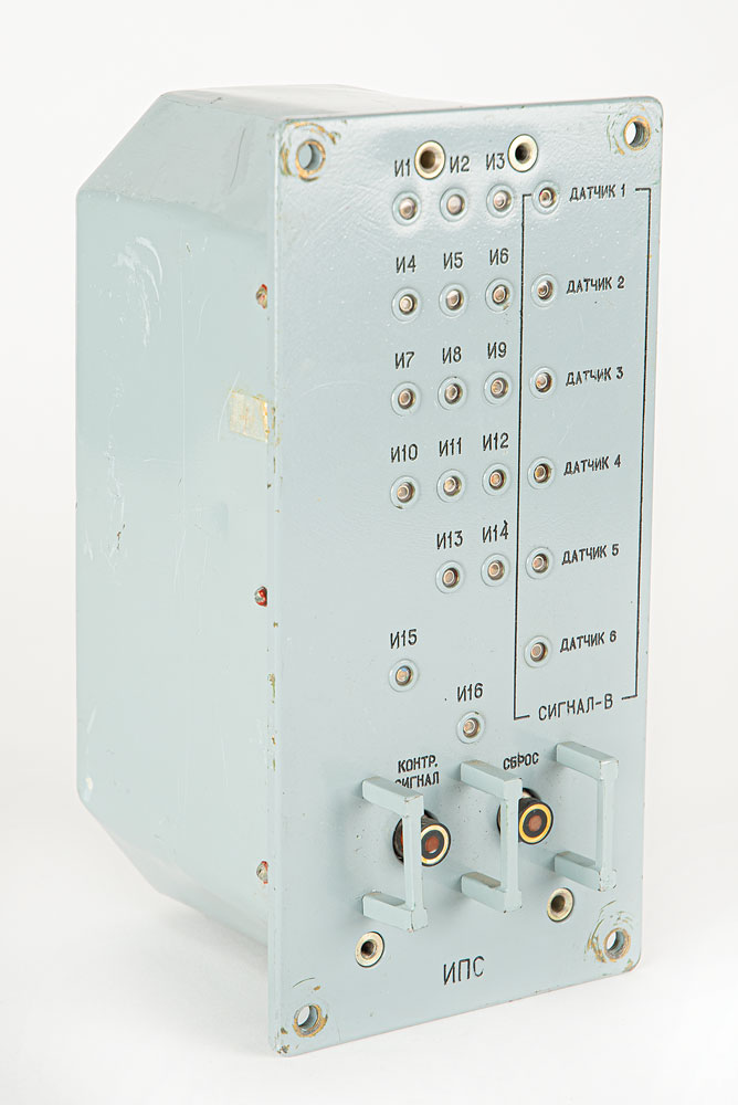 Early Soyuz spacecraft fuse/breaker panel with test points for checking battery voltages going to equipment, measuring 5″ x 10″ x 5.5″, marked with Cyrillic lettering. In fine condition.