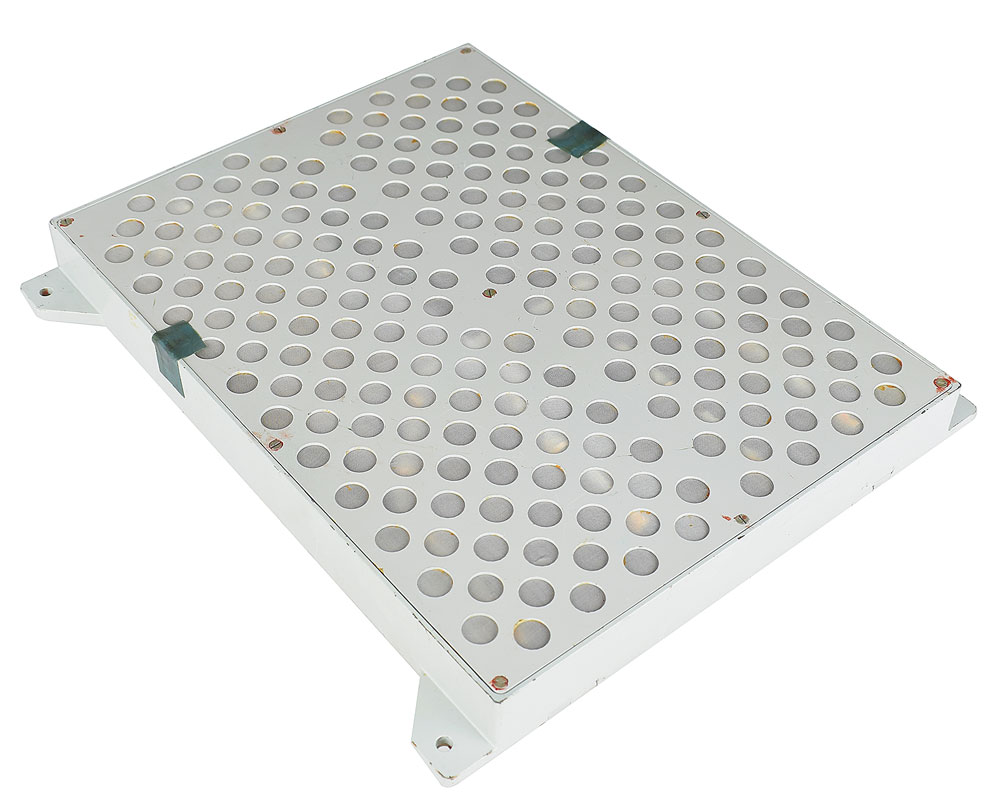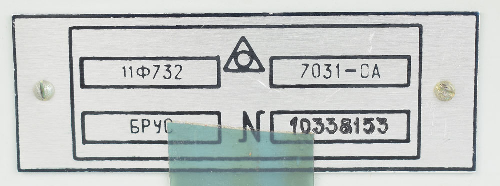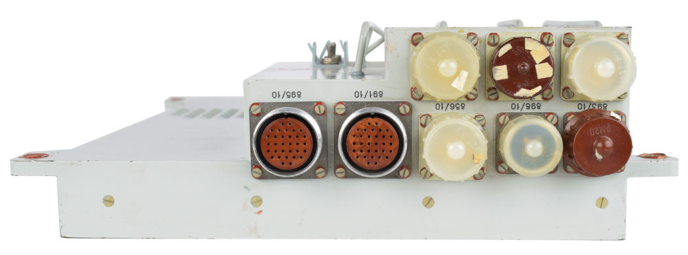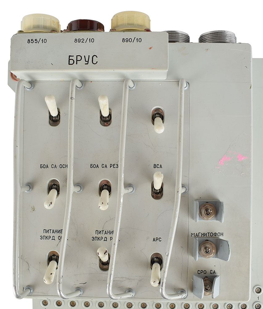 BRUS device (switch/fuse panel) from the left wall of a Soyuz-TM descent module, measuring 13.25″ x 15.75″ x 4.25″, featuring nine white toggle switches, three metal toggle switches, and a screw-down door that opens to reveal a 68-fuse panel. In very good condition, with bent guards around the switches.
