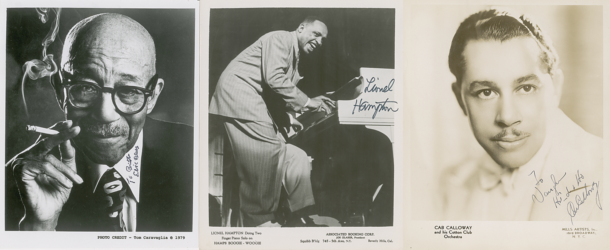 Grouping of three photos signed by notable jazz musicians: a vintage glossy 8 x 10 close-up portrait of Cab Calloway, signed and inscribed in fountain pen, "To Vaughn, Hi-de-ho, Cab Calloway"; a glossy 8 x 10 photo of Lionel Hampton at his piano, signed in black felt tip, "Lionel Hampton"; and a glossy 8 x 10 photo of Eubie Blake smoking, signed and inscribed in black felt tip by Blake. In overall very good to fine condition, with scattered light creasing to Calloway.