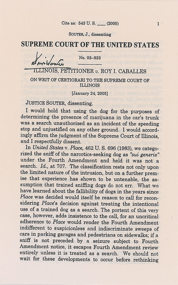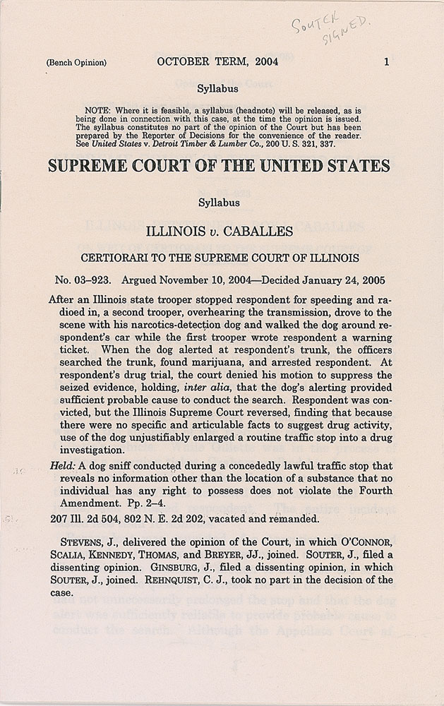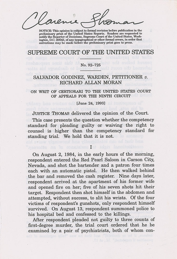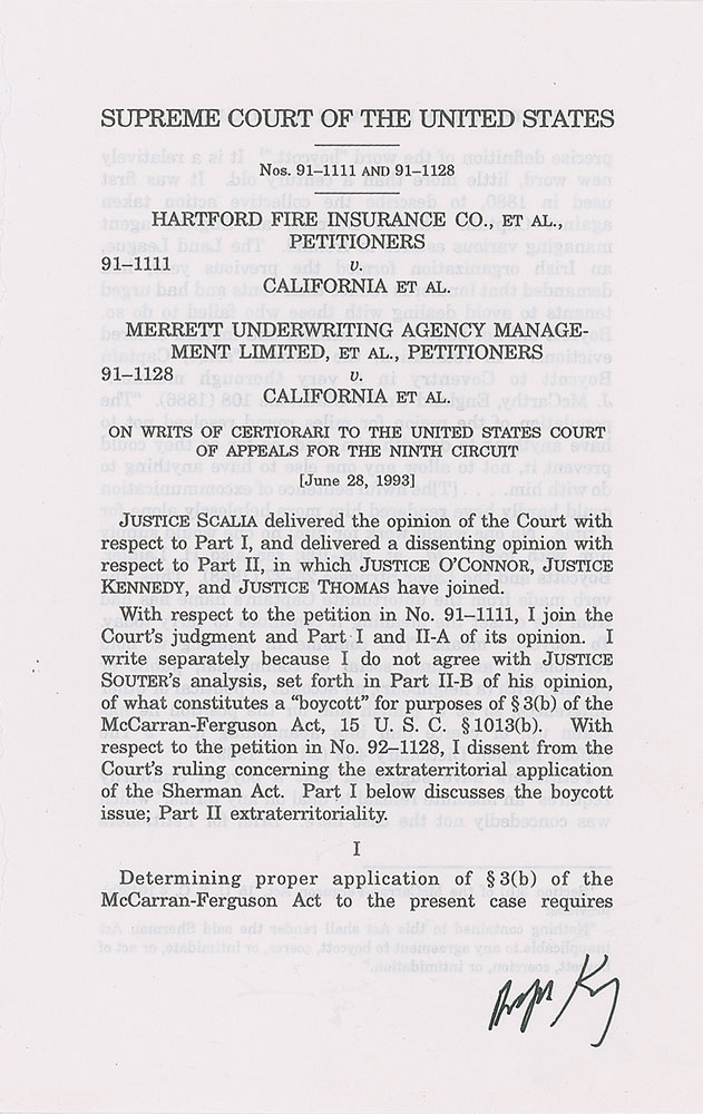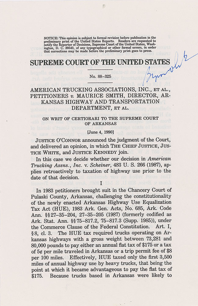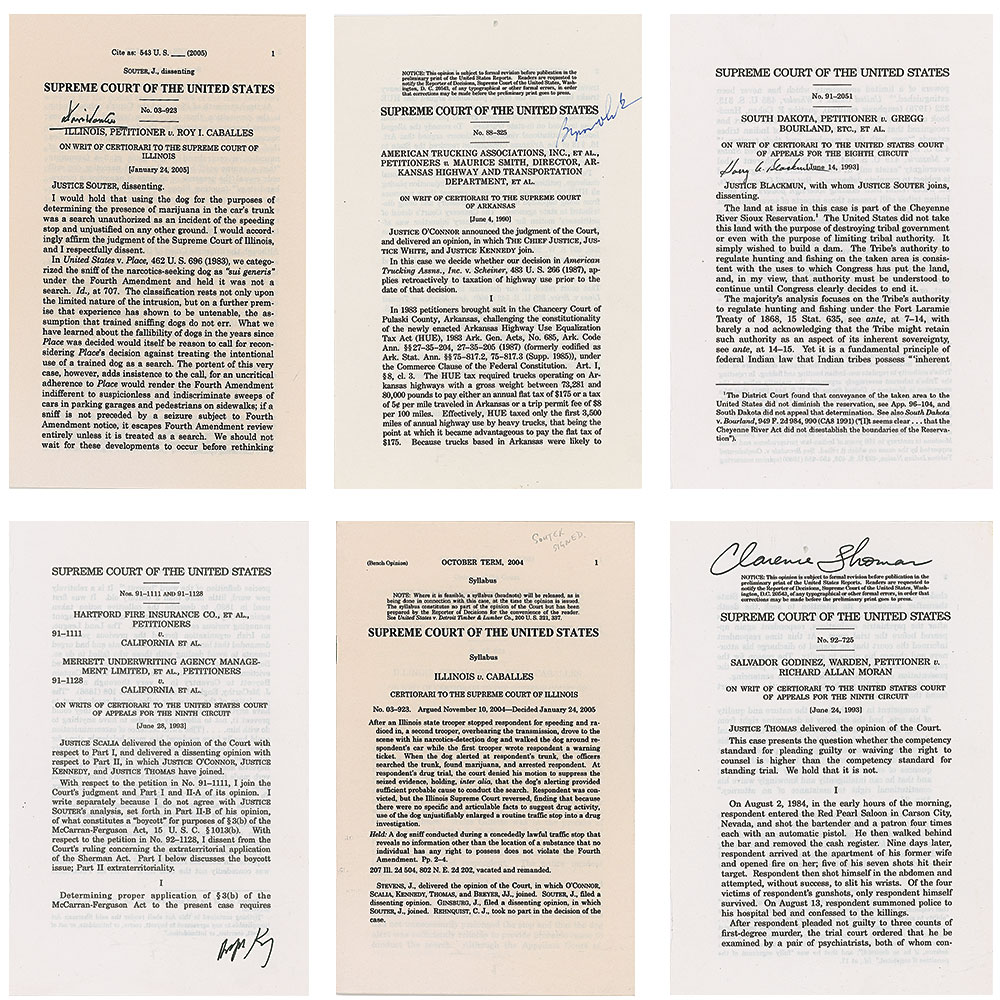 Five typescripts of Supreme Court opinions, mostly disbound, each signed by an associated justice, including: Clarence Thomas (Godinez v. Moran), Byron R. White (American Trucking Associations v. Smith), Harry A. Blackmun (South Dakota v. Bourland), Anthony Kennedy (Hartford Fire Insurance Co. v. California), and David Souter (Illinois v. Caballes). In fine condition, with most of the pages detached but present.