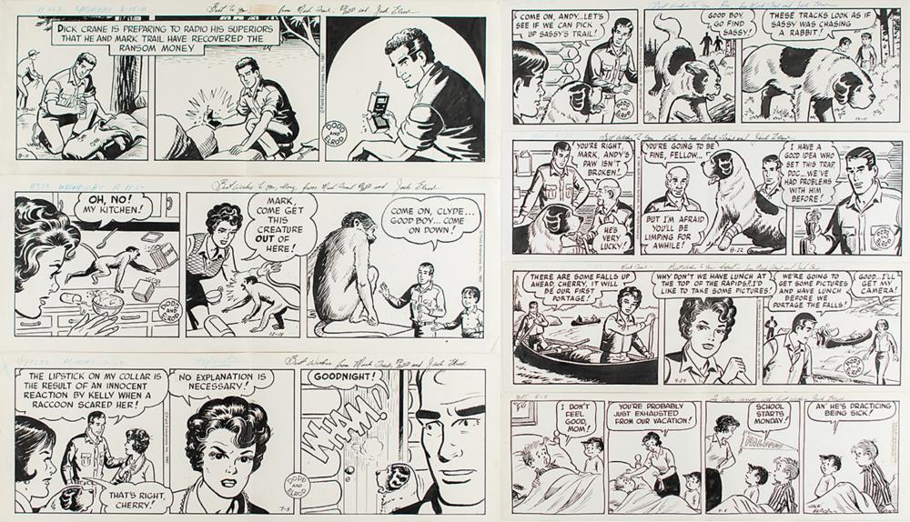 American cartoonist (1924-2016) best known for the comic strip Mark Trail, which he took over following the retirement of its creator Ed Dodd. Group of seven original hand-inked comic strips by Jack Elrod, ranging in size from 17 x 5.5 to 20 x 7, each signed and inscribed in the upper margin by Elrod. The comic strips are dated from 1970 to 1991. In overall fine condition, with all strips folded in half.