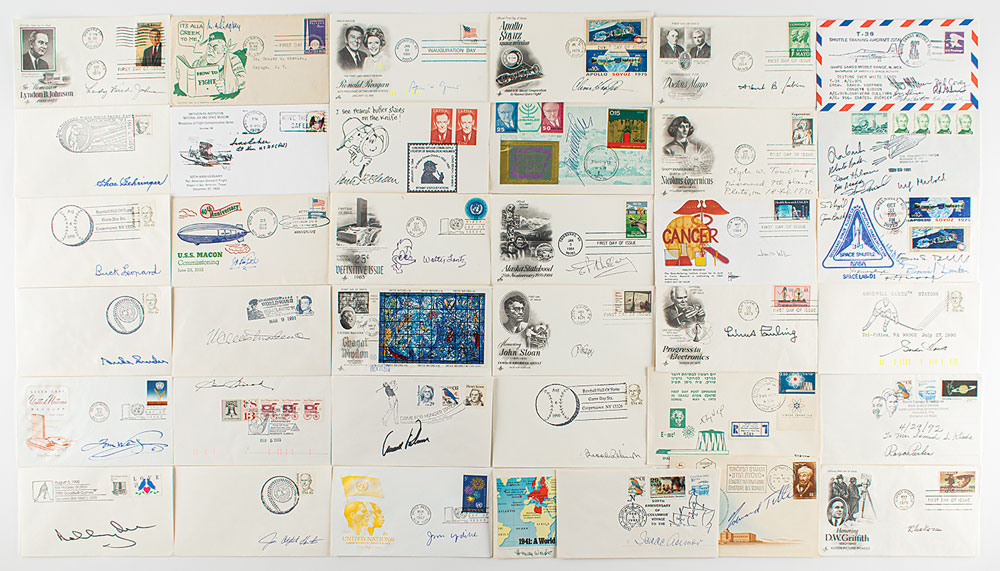 Collection of over 150 commemorative covers and FDCs signed by a wide variety of scientists, politicians, athletes, military personnel, aviators, artists, authors, Space Shuttle astronauts, and other figures of note. Especially notable signatures are as follows: Spiro T. Agnew, Isaac Asimov, Peter Benchley, John Cage, James H. Doolittle, Ira Eaker, Charles Gehringer, William Golding, Goose Gossage, Edmund Hillary, Al Hirschfeld, Gordie Howe, Bobby Hull, Jim ‘Catfish’ Hunter, Lady Bird Johnson, Elia Kazan, Hank Ketcham (with sketch), Chris Kraft, Walter Lantz (with sketch), Buck Leonard, Bobby Orr, Arnold Palmer, Rosa Parks, Linus Pauling, Maurice Richard, Mathew Ridgway, Brooks Robinson, Albert B. Sabin, Jehan Sadat, Reg Smythe (with sketch), Sam Snead, Duke Snider, Edward Teller, Clyde W. Tombaugh, John Updike, James D. Watson, William C. Westmoreland, Elie Wiesel, Simon Wiesenthal, Tom Wolfe, and Herman Wouk. In overall fine condition.