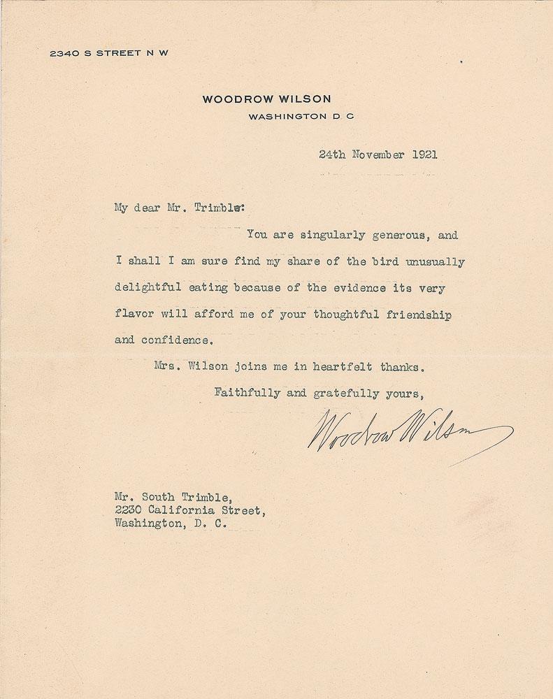 TLS, one page, 7 x 9, personal letterhead, November 24, 1921. Letter to former Congressman South Trimble, in full: "You are singularly generous, and I shall I am sure find my share of the bird unusually delightful eating because of the evidence its very flavor will afford me of your thoughtful friendship and confidence. Mrs. Wilson joins me in heartfelt thanks." In fine condition. Trimble had provided the White House's Thanksgiving turkey throughout the Wilson presidency, and evidently continued the tradition for Wilson's first Thanksgiving dinner after leaving office.