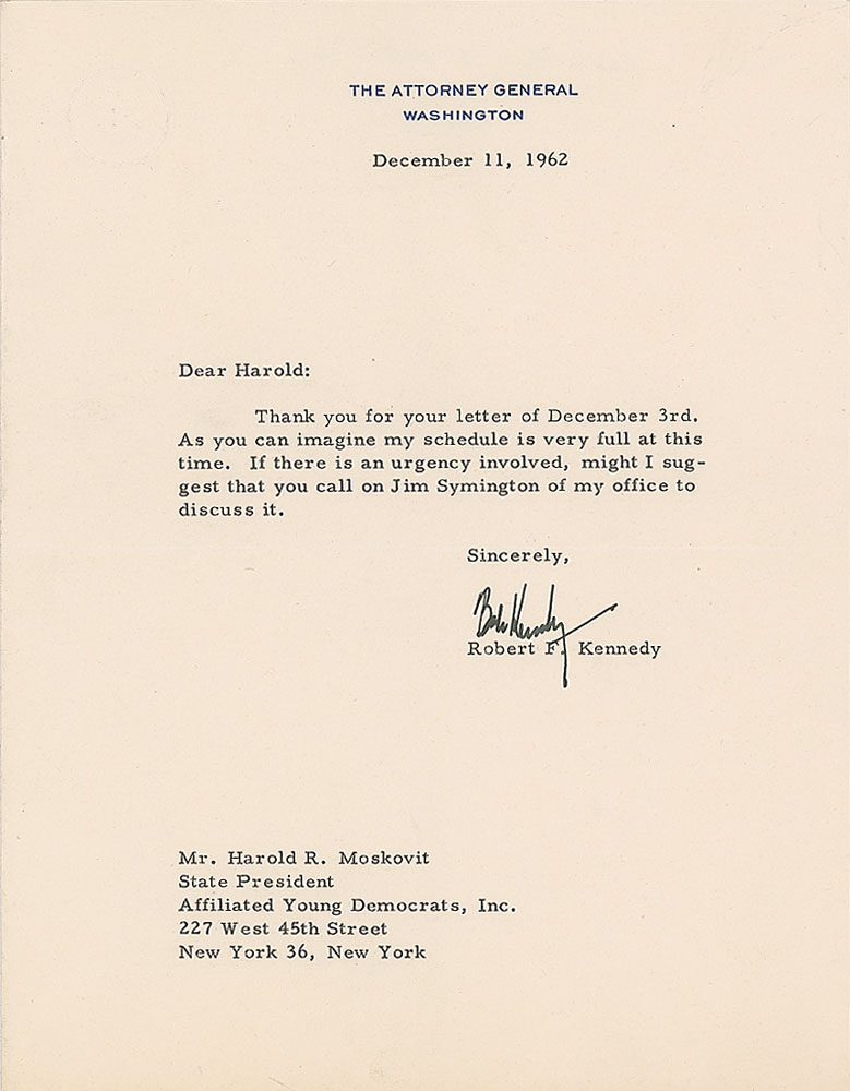TLS signed “Bob Kennedy,” one page, 7 x 9, Attorney General letterhead, December 11, 1962. Letter to Harold R. Moskovit, New York State President of the Affiliated Young Democrats. In full: "Thank you for your letter of December 3rd. As you can imagine my schedule is very full at this time. If there is an urgency involved, might I suggest that you call on Jim Symington of my office to discuss it." In fine condition.
