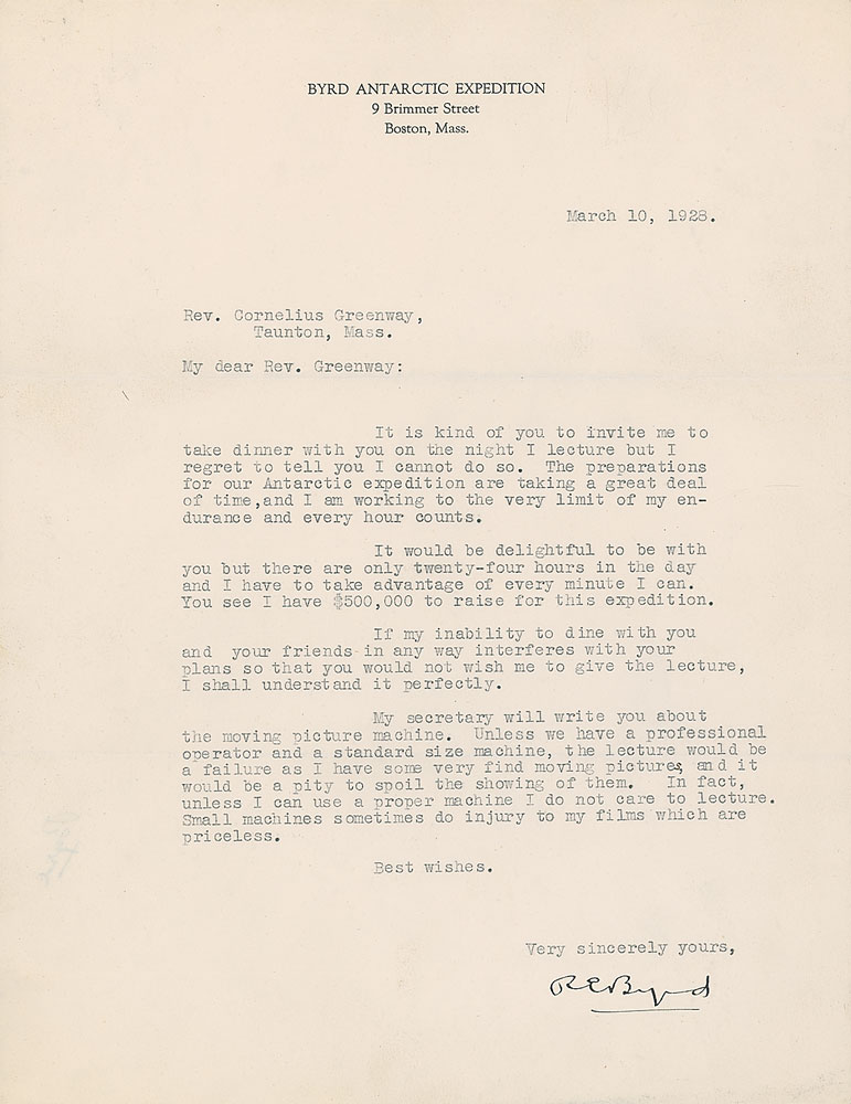 TLS signed “R. E. Byrd,” one page, 8.5 x 11, Byrd Antarctic Expedition letterhead, March 10, 1928. Letter to Rev. Cornelius Greenway, in part: "It is kind of you to invite me to take dinner with you on the night I lecture but I regret to tell you I cannot do so. The preparations for our Antarctic expedition are taking a great deal of time, and I am working to the very high limit of my endurance and every hour counts?there are only twenty-four hours in the day and I have to take advantage of every minute I can. You see I have $500,000 to raise for this expedition." In fine condition.