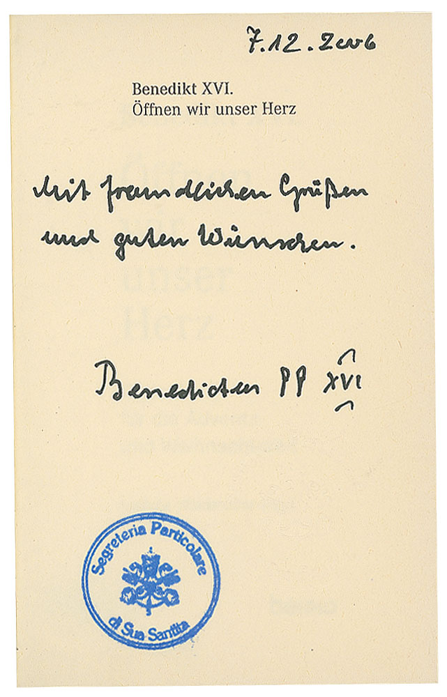 Signed book: Offnen wir unser Herz. Leipzig: Editions Radio Vatikan/St. Benno-Verlag. Hardcover, 4.25 x 6.25, 144 pages. Signed on the half-title page in black felt tip in German (translated): "7.12.2006, With kind regards and best wishes, Benedictus PP XVI." The signed page bears official ink and embossed stamps. In fine to very fine condition.
