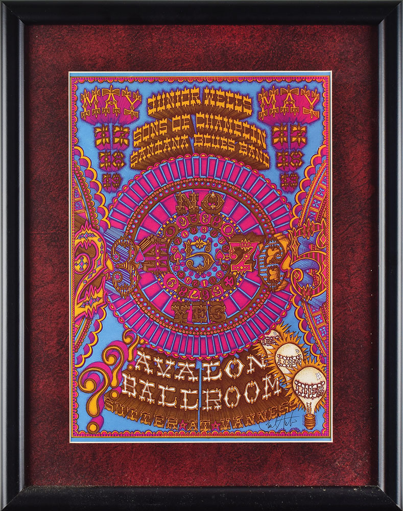 Gorgeous color 13.25 x 18.75 Family Dog poster (FD119-PO) for a series of concerts by Junior Wells, the Sons of Champlin, and the Santana Blues Band at the Avalon Ballroom in San Francisco on May 17-19, 1968, signed in the lower right corner in black felt tip by Carlos Santana. The central image is an elaborately decorated circle surrounded by complex, three dimensional lettering. On the left side are three question marks and on the other three light bulbs with the word 'Idea.' Matted and framed to an overall size of 20.5 x 26. In fine condition.