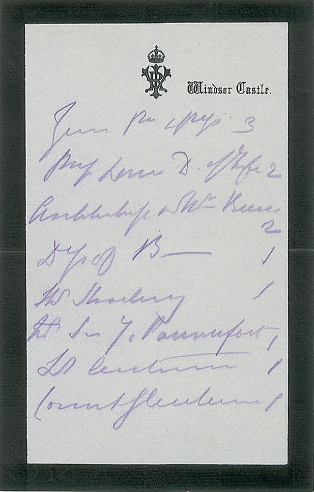 Unsigned handwritten notes in pencil by Queen Victoria, one page, 4.5 x 7, Windsor Castle stationery, no date. A prospective guest list, in full: "Queen Pr. & Prncss 3, / Prncss Louise D. of Fife 2 / Archbishop & Mrs. Benson 2, Dcss of B— 1 / Mr. Shoebury 1 / Sir J Pauncefoot 1 / Ly Antrim 1 / Count Gleichen 1." In fine condition.