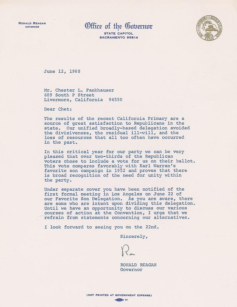 TLS signed “Ron,” one page, 8.5 x 11, California Office of the Governor letterhead, June 12, 1968. Letter to Chester L. Fankhauser, in part: "The results of the recent California Primary are a source of great satisfaction to Republicans in the state. Our unified broadly-based delegation avoided the divisiveness, the residual ill-will, and the loss of resources that all too often have occurred in the past. In this critical year for our party we can be very pleased that over two-thirds of the Republican voters chose to include a vote for us on their ballot. This vote compares favorably with Earl Warren's favorite son campaign in 1952 and proves that there is broad recognition of the need for unity within the party." In fine condition.