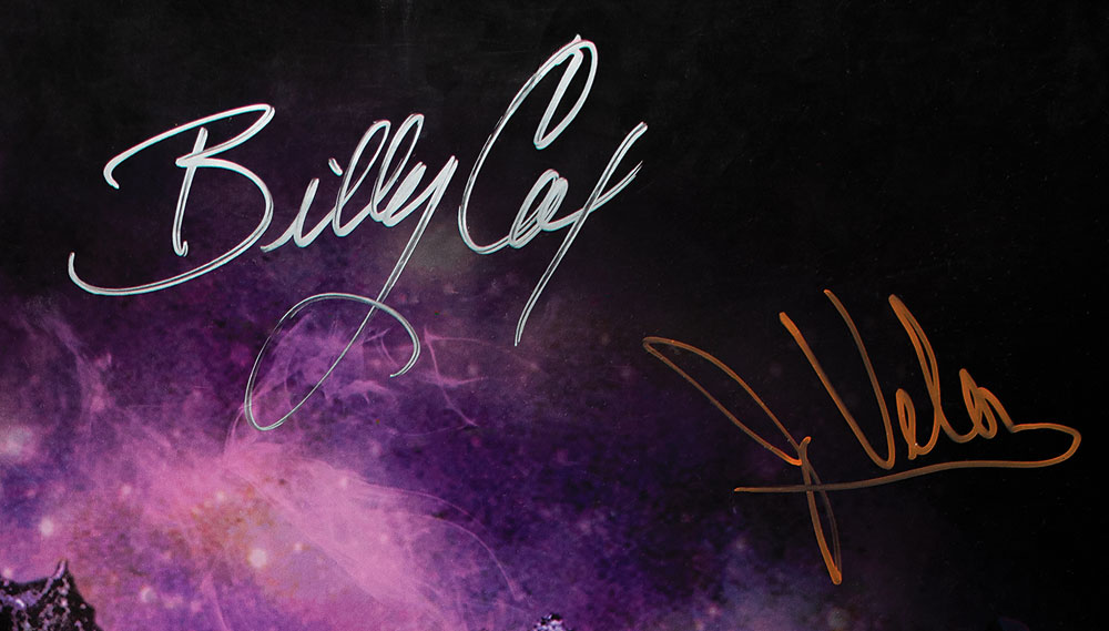 Color 24 x 36 poster for the classic Jimi Hendrix psych rock song 'Purple Haze,' featuring a collage of the legendary guitarist surrounded by a purplish mist, signed by three members of his Band of Gypsys—in silver ink by Billy Cox, in orange paint pen by Jerry Velez, and in purple paint pen by Juma Sultan, who adds "Gypsy Sun & Rainbows, Woodstock 1969," and lyrics to 'Purple Haze.' Rolled and in very good to fine condition, with creasing to the upper right corner.