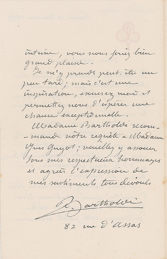 Eminent French sculptor (1834-1904) best known for designing the Statue of Liberty. ALS in French, signed “Bartholdi,” one page both sides, 4.5 x 7, personal letterhead, January 10, 1895. Letter to a gentleman, in full (translated): "I come to receive the visit of Miss Smedley who came from you; it reminds me that for a long time I would have wanted to let you know a bit about my works and my workshop. However Mr. and Mrs. Goudchaun and a few friends come to dine with us Tuesday, January 15th at 7 1/2 hours without ceremony, in office attire. If you would be so kind as to make friends with Madame Yves Guyot to honor your presence, this intimate little meeting, you would be very happy. I may be doing it a little late; but it is an inspiration, excuse me and allow us to hope an exceptional chance. Madame Bartholdi recommends your request to Madame Yves Guyot; please assure all my respectful tributes and accept the expression of my all devoted feelings." In fine condition.
